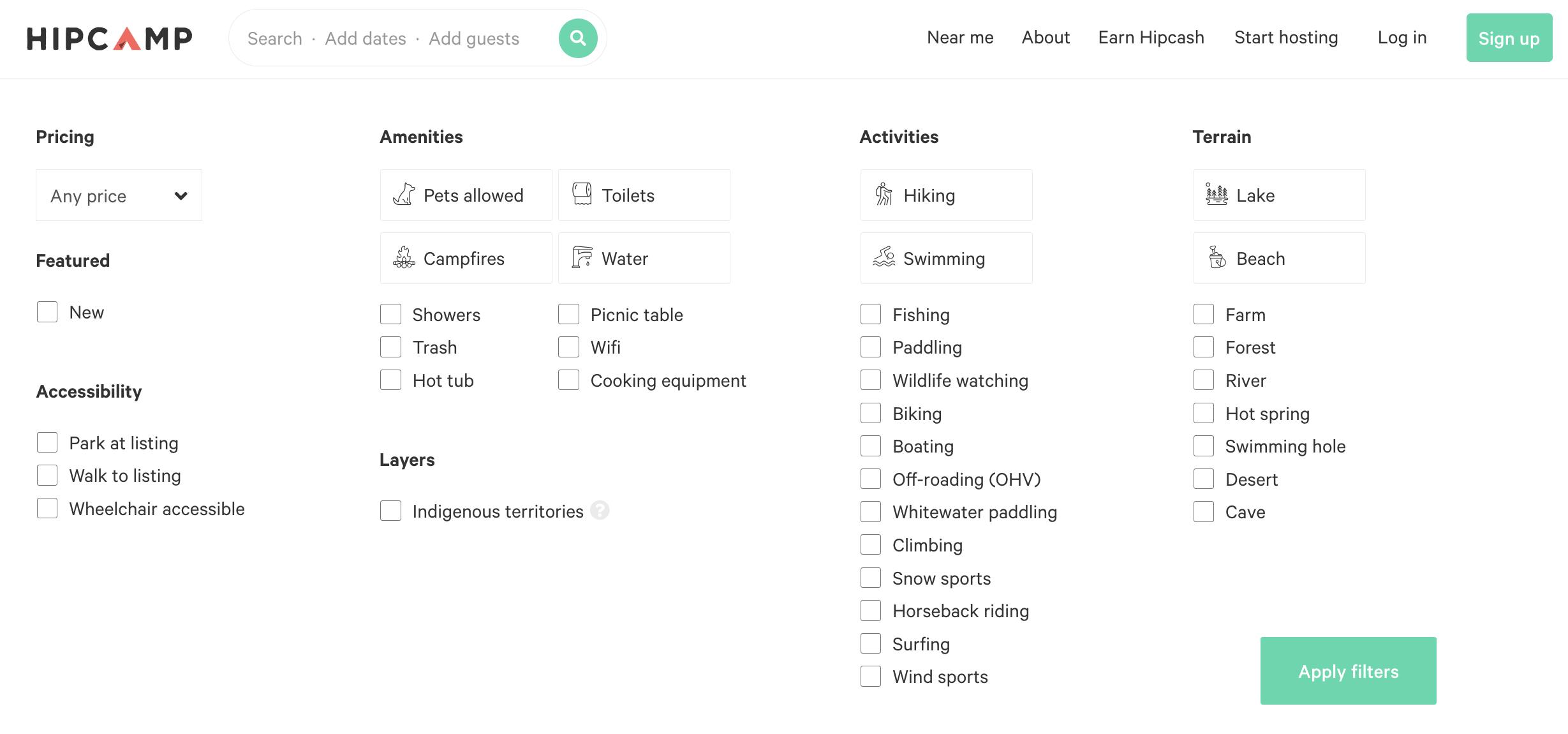 Users can filter stays by price, accessibility, amenities, activities, terrain, and other categories. All these options provide choices for users who may want to avoid roughing it in a tent but still want to experience the great outdoors.