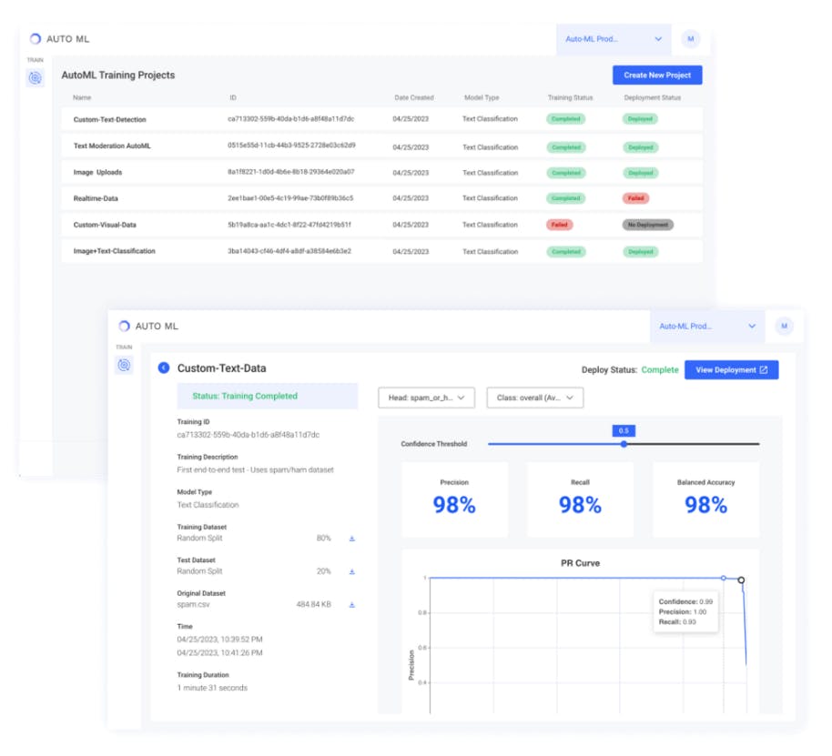 AutoML: Hive’s AutoML platform allows customers to train, evaluate, and deeply customize machine learning models. By downloading a dataset of images, videos, and more, customers can use the AutoML platform to guide them to create a fully-functioning model accessible through API and served through Hive’s data. Models that are built with AutoML can have up to 20 classification categories.