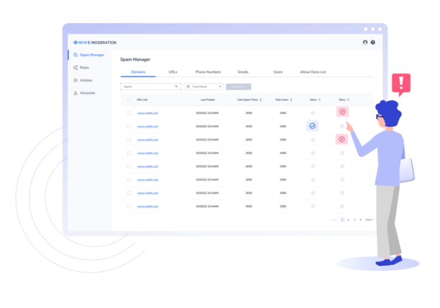 Moderation Dashboard: The moderation dashboard is built on top of Hive’s content moderation APIs. It helps companies manage and moderate content on its platform. It enables companies to set up custom actions and rules to implement into their content moderation policies without processing Hive’s model responses directly.