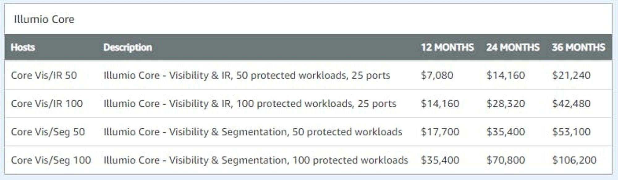 Illumio does not publicly disclose its pricing model. However, customers can purchase Illumio Core through Amazon Web Services, and pricing is based on pricing level and number of protected workloads and ports. Purchasing Illumio’s most basic Core package for one year starts at around $7.1K per year, and can scale up to $35.4K per year for additional segmentation features and additional workloads.