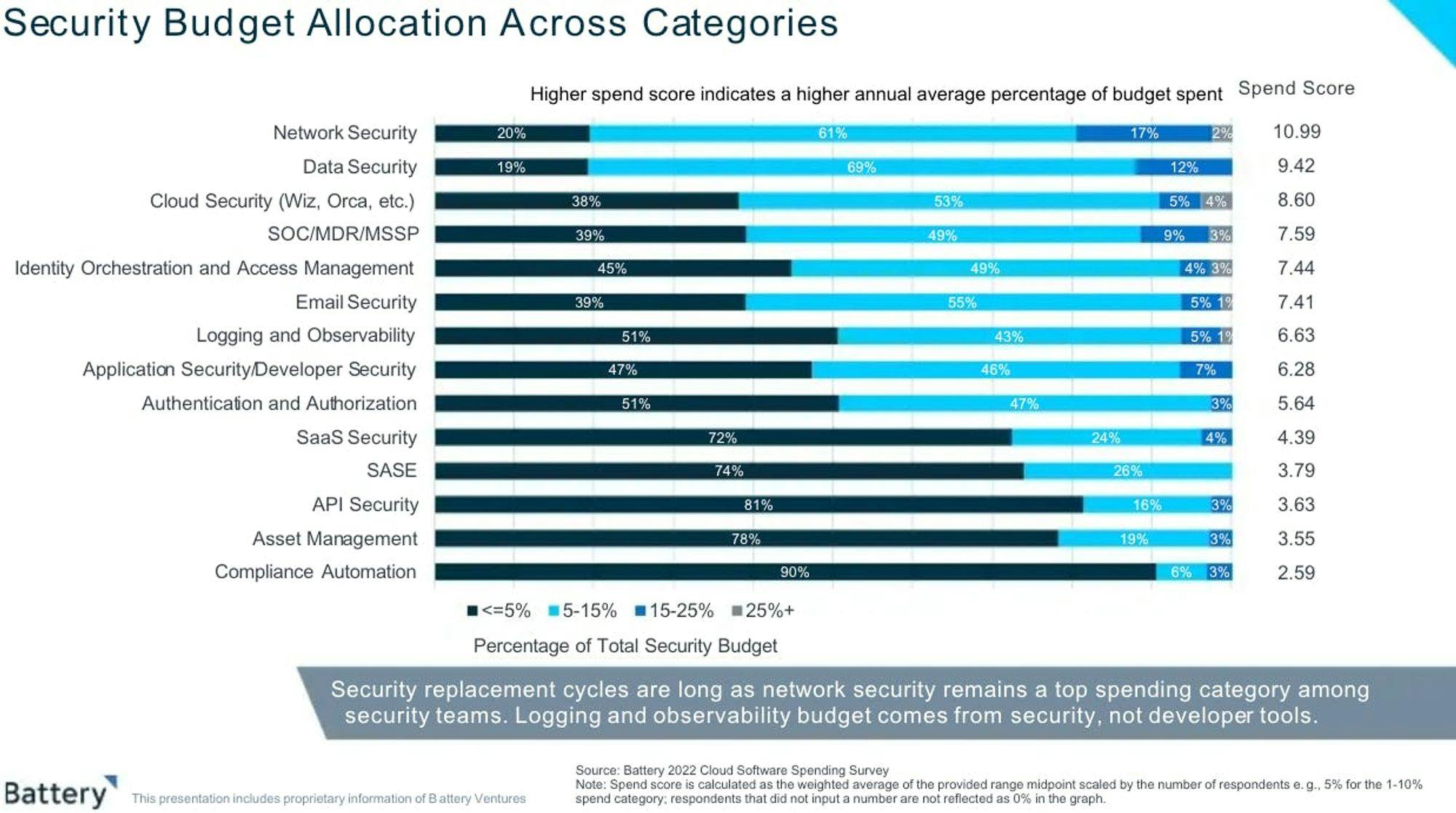 Security budgets remain resilient despite the market downturn from 2022-2023. Specifically, network security received a higher allocation than other categories of cybersecurity. A breakdown of security budgets in 2022 can be seen below: