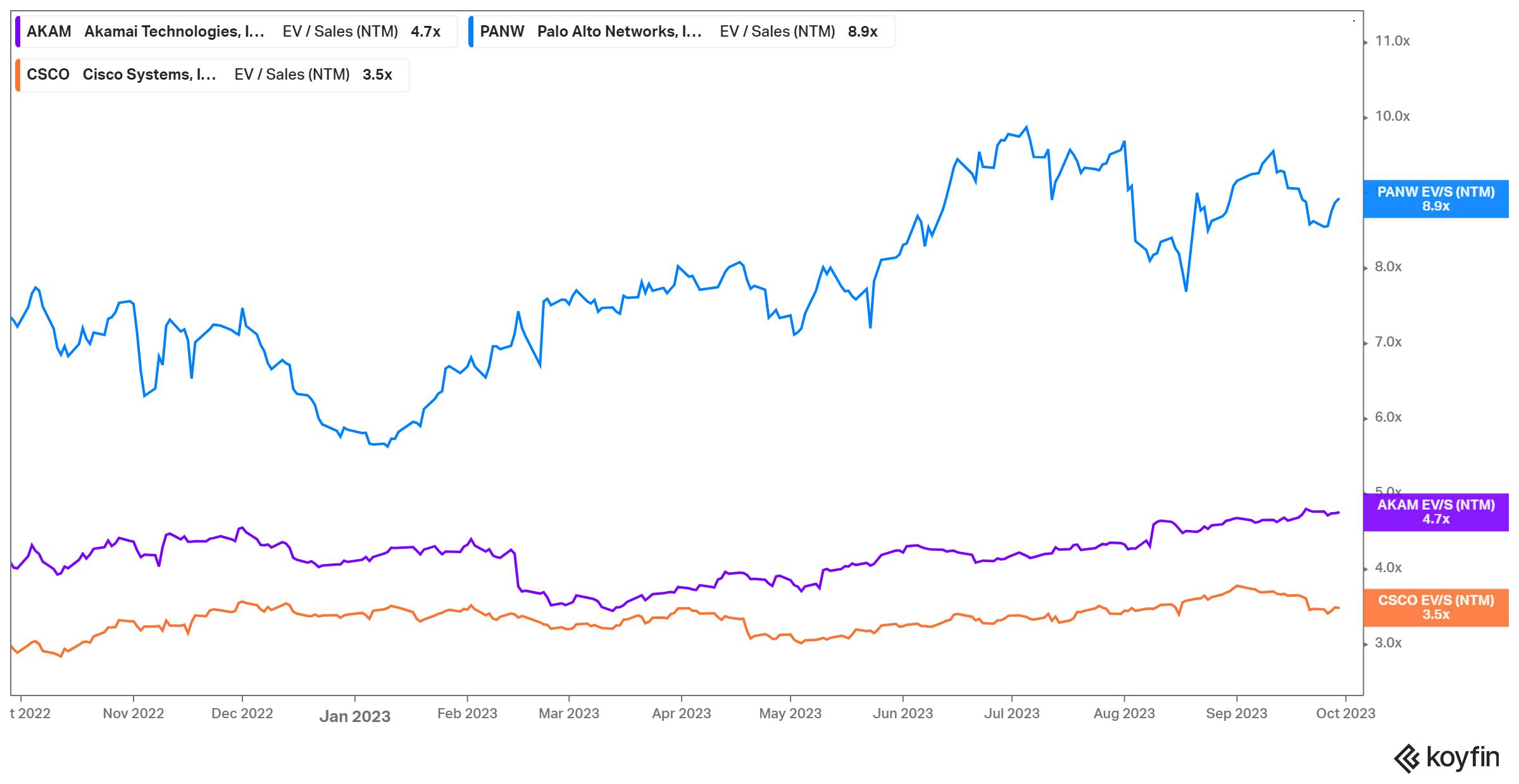 In public markets, cybersecurity companies have seen relatively steady revenue multiples. As of September 2023, security companies such as Palo Alto Networks, Akamai, and Cisco had revenue multiples of 8.9x, 4.7x, and 3.5x respectively. However, it is important to keep in mind that these companies offer products outside of zero trust and microsegmentation, meaning these can only partially be used in comparison to Illumio.