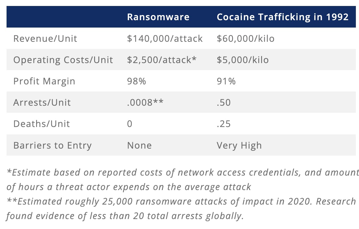 One reason ransomware is so persistent is because the outcome is profitable without significant operational costs or meaningful risks. An extreme example illustrated below compares the economic outcomes of a digital crime like ransomware to a physical crime like cocaine trafficking at its peak in 1992, illustrating the economic appeal of a criminals to use ransomware. Given the growing interest in ransomware, there is an opportunity for Illumio to leverage microsegmentation as the default way for counteracting ransomware attacks.