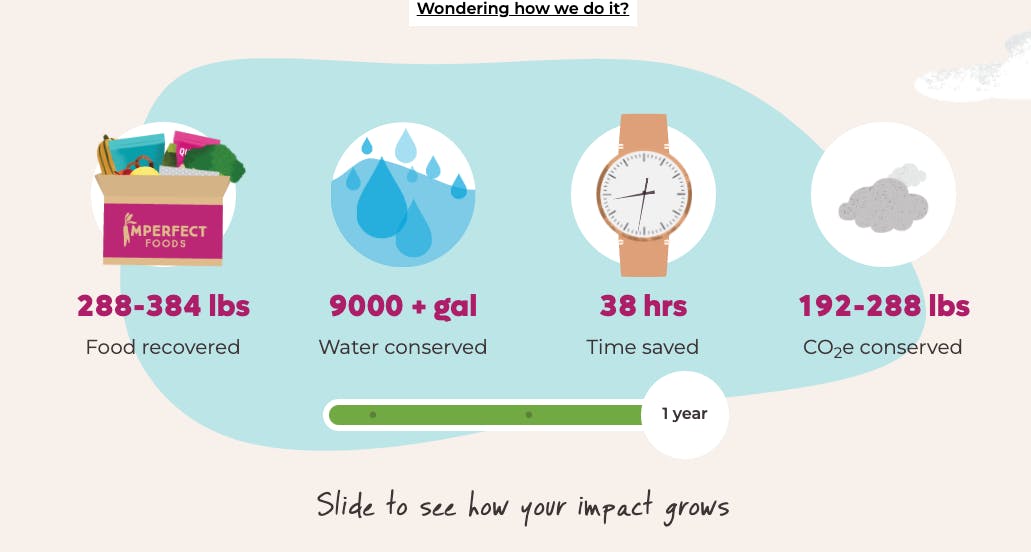 The company appeals to its customers not only in the way that it sources its products but also in how it communicates its value proposition. As of November 2023, it features the fact that it has saved 166.4 million pounds of total food on its website homepage, and includes a slider animation that shows how buying from Imperfect Foods over time can both save time as well as save the environment.