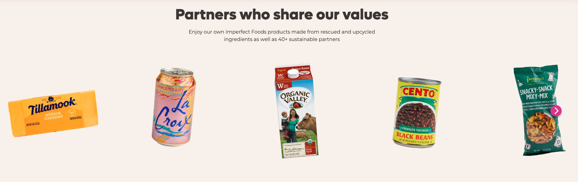 In 2019, Imperfect Foods expanded its product lines to include grocery staples like dairy, meat, and seafood; this is also when it rebranded from Imperfect Produce to Imperfect Foods. Some product lines included rescued goods like excess food inventory that would have otherwise become landfill waste. In 2021, the company also added a small lineup of wellness products such as facial oil, body butter, and soap. It also carries non-produce brands like La Croix sparkling water, Organic Valley almond milk, or Boom Chicka Pop popcorn that the company says “shares your values” as an Imperfect Foods customer.