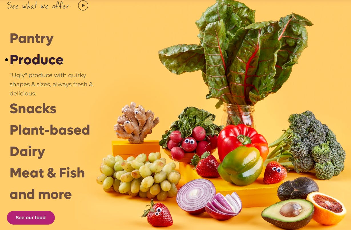 Cosmetic imperfections: Items that are “deemed too unsightly for regular grocery stores” and contain “small blemishes, scars, and wonky shapes” that can make the “perfectly good food harder for producers to sell.”