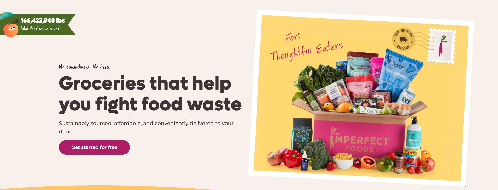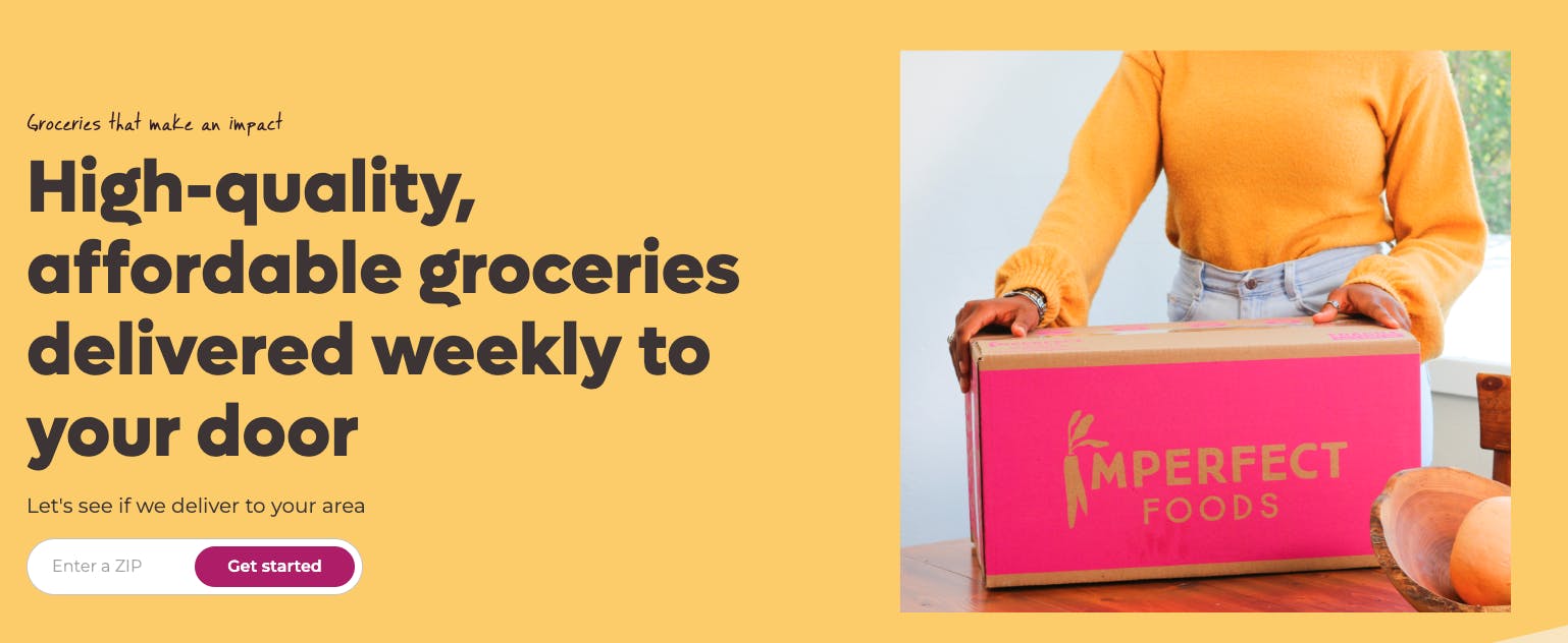 Imperfect Foods aims to be a convenient, sustainable, and affordable grocery delivery service. It offers a suite of products and direct-to-consumer delivery, attempting to replace customers’ trips to the grocery store. It also positions itself as a sustainable delivery option, with deliveries taking place in recycled boxes, delivery routes consolidated to minimize carbon emissions, and the company taking back packaging for reuse or recycling.