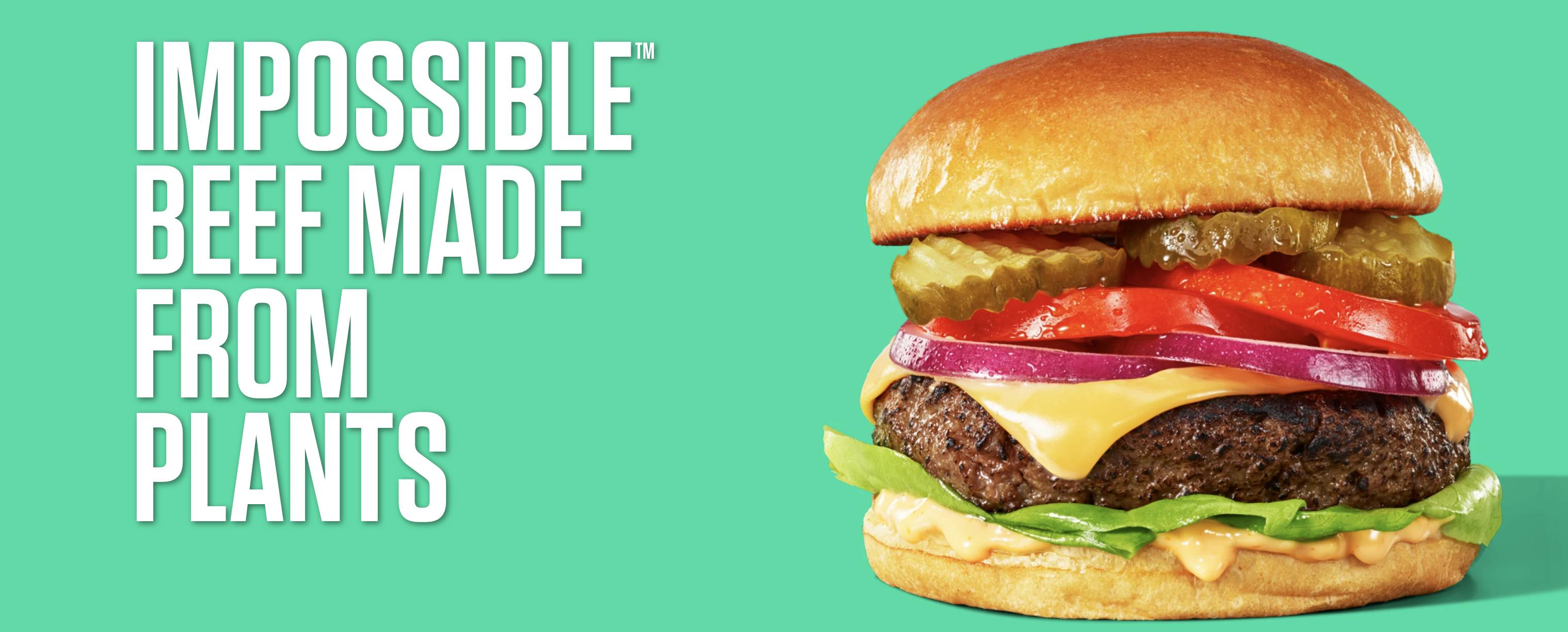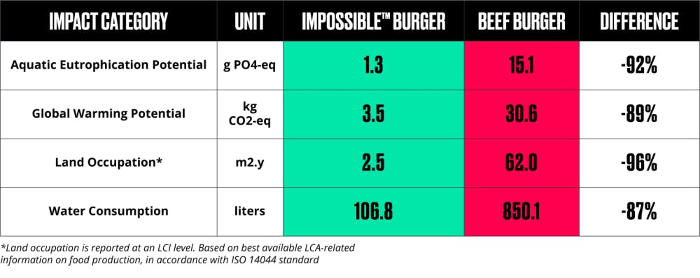 The company launched its first ground beef product in 2016. The key ingredients that made up this product include soy, heme, sunflower oil, coconut oil, and various binding agents. Impossible Foods beef products are sold both as ground meat and in meat patty form. Impossible Foods estimates that their beef has a significantly lower environmental footprint than animal meat, and claims that its products require 96% less land, 92% less water, and 91% less GHG emissions in order to produce.