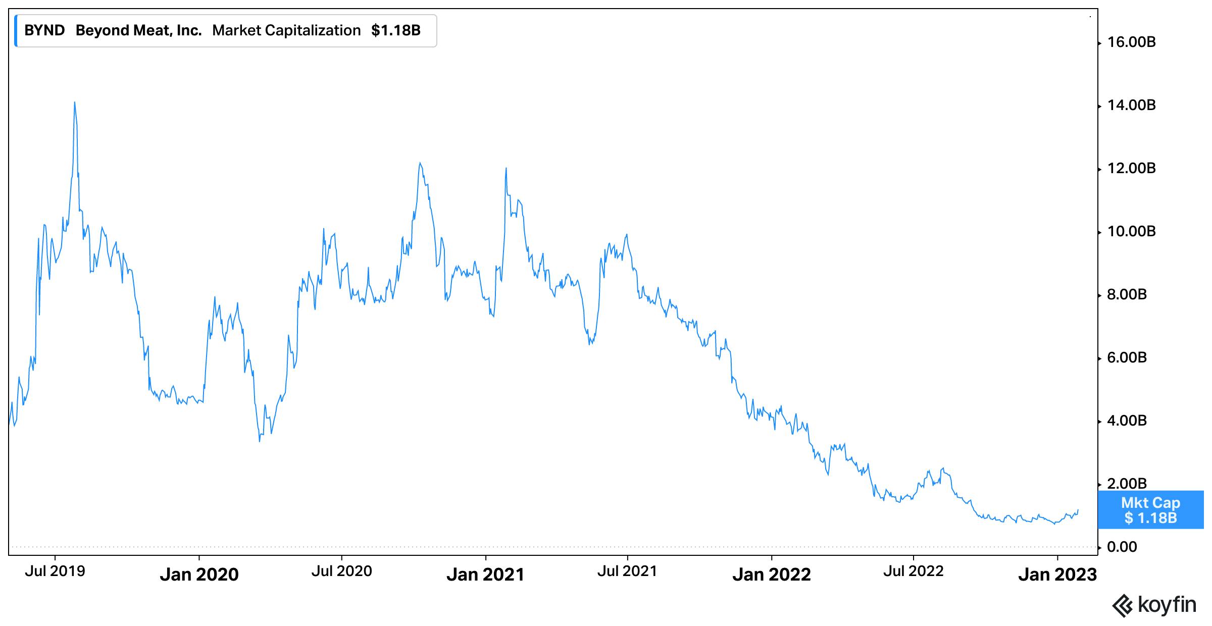In terms of revenue, Beyond Meat expects to earn between $400 million and $425 million in fiscal year 2022, representing a decrease of between 14% and 9% in sales compared to 2021. The company attributes its decline in sales to the current macro environment. The company lost $101.7 million in the third quarter of 2022 alone. In order to mitigate losses, Beyond Meat announced in October 2022 that it would lay off 19% off its workforce. As of December 2022, since IPO, Beyond Meat’s stock ($BYND) is down around 80%. With Impossible Foods reportedly doing around $137 million in revenue in 2021 growing at 70% year over year, Beyond Meat is the larger company between the two, but with a significantly worse growth profile.