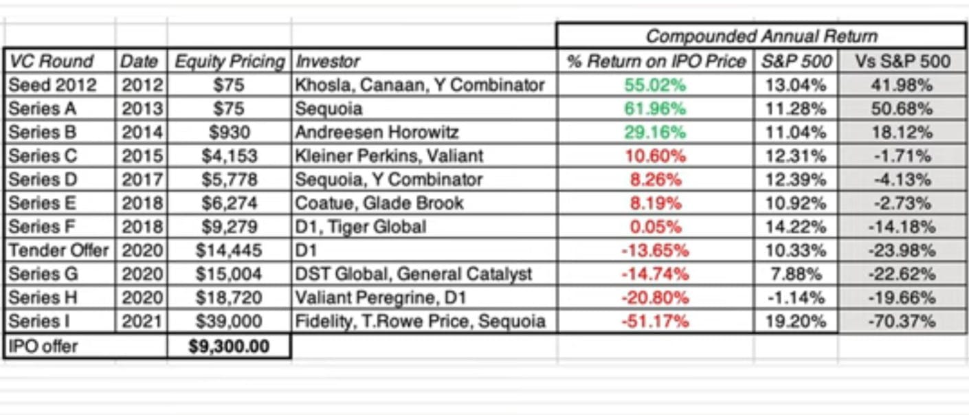 As of the beginning of 2023, the company, previously valued at $39 billion, reduced its internal valuation to as low as $10 billion. It submitted an SEC filing to IPO in 2022 after hyper-growth in 2021 but submitted a draft registration statement in October 2022. Instacart went public in September 2023 at a market cap of ~$14 billion. This IPO price represented a significant loss for many later investors of Instacart, with its peak valuation private markets being almost 3x its market cap at IPO.