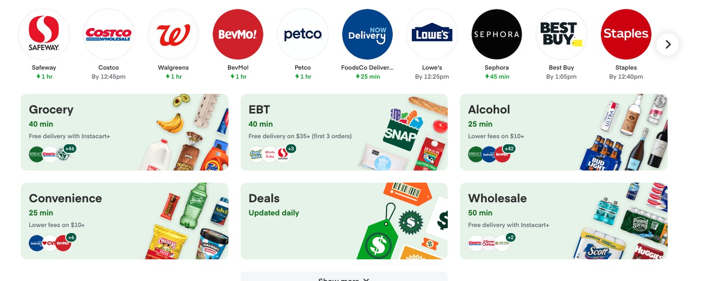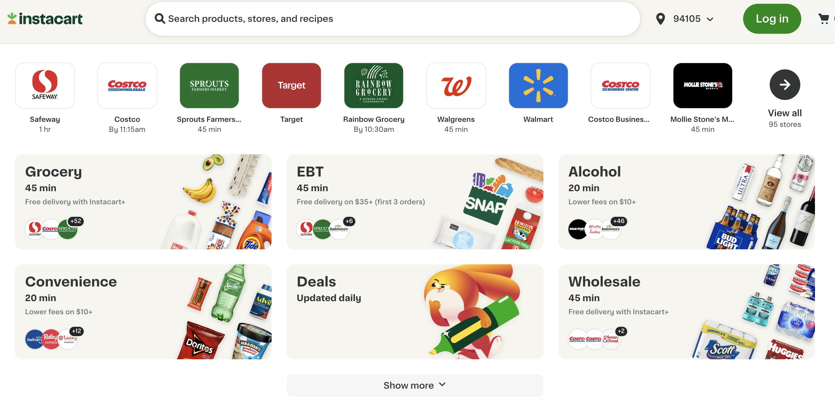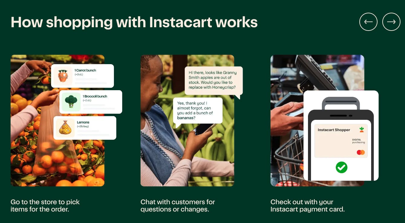 Instacart consumers are typically looking for a convenient way to shop for groceries and household items from their local stores without having to leave their homes. Customers can pick up groceries from the store, have them delivered for a fee, or subscribe to Instacart+ for free deliveries above $35.