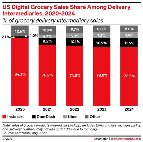 As of April 2021, Instacart was available to over 85% of US households and 70% of Canadian households. By mid-2022, Instacart had captured an estimated 3% share of the total grocery ecommerce market (up from 1% in 2019). Ecommerce orders fulfilled by delivery grew an estimated 77% from 2019 to 2021 and are expected to continue to grow.
