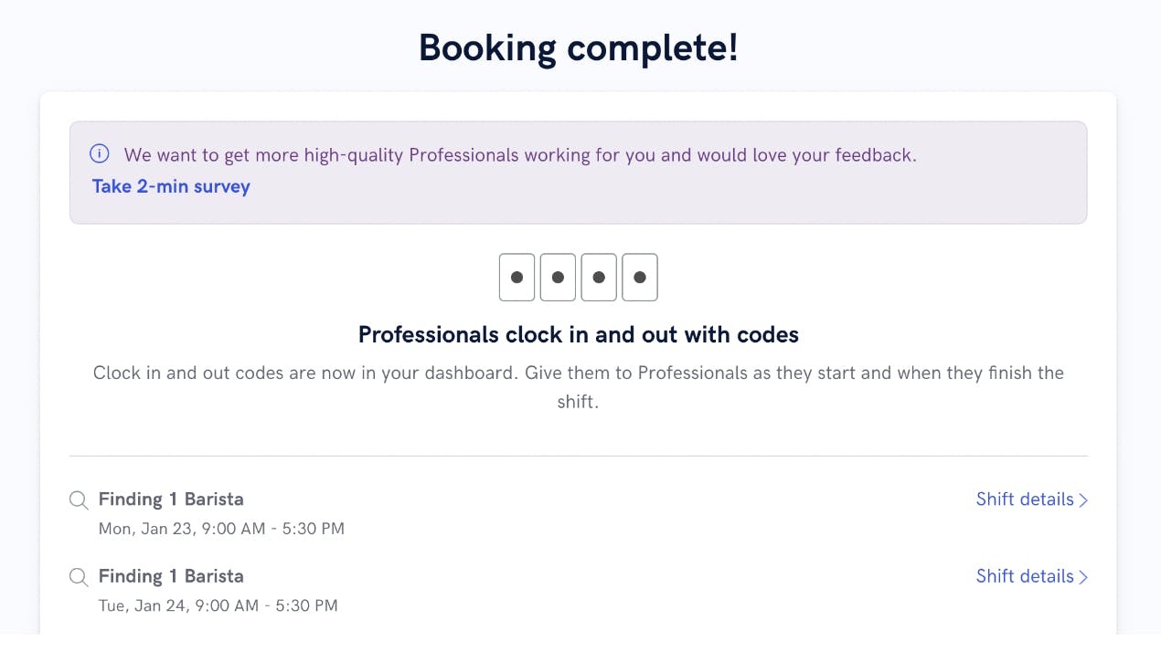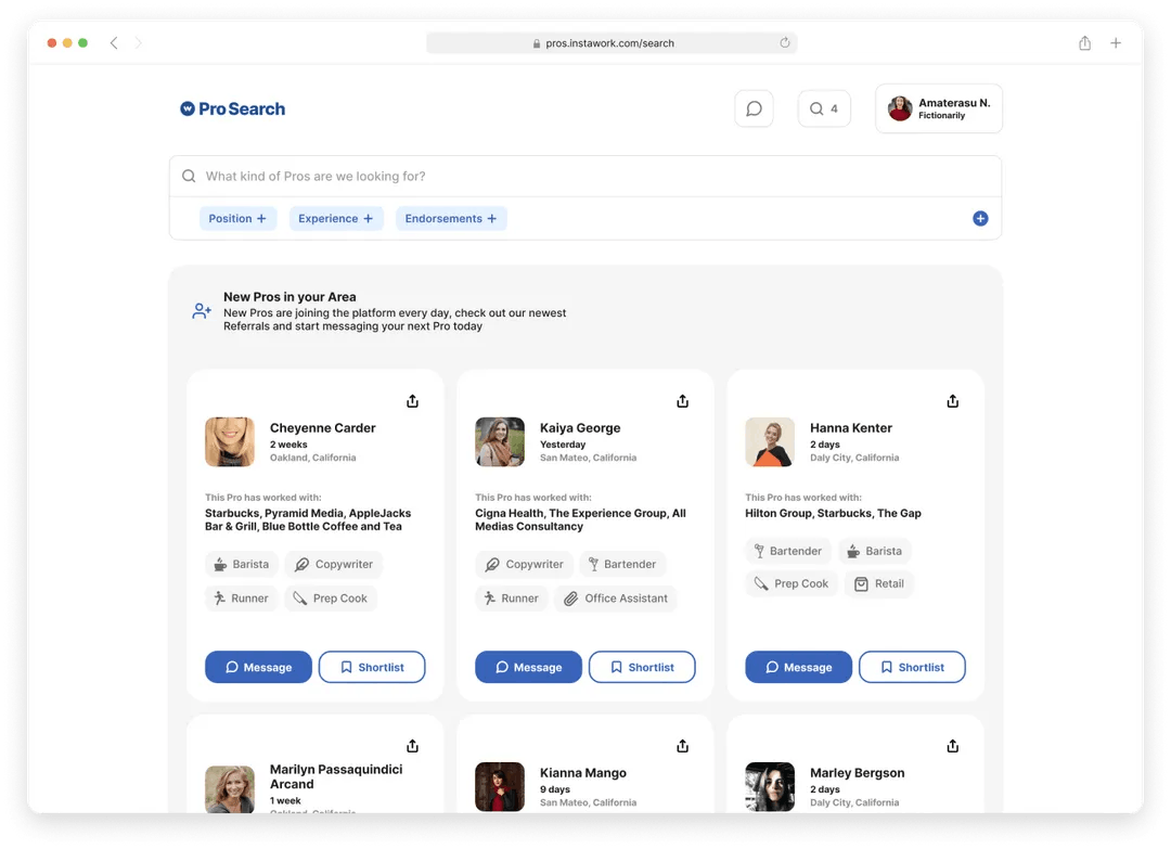 Instawork also enables businesses to hire full-time workers for roles that require more permanent staffing compared to a temporary, hourly position. Partners can access a Pro Search, a marketplace that shows available full-time workers, Pros, who are qualified and seeking work. Instawork claims over 5 million Pros on the platform as of November 2023. The company ensures a quality pool of workers by collecting past work experience and recommendations, conducting a background check, and requiring a quiz for some positions.