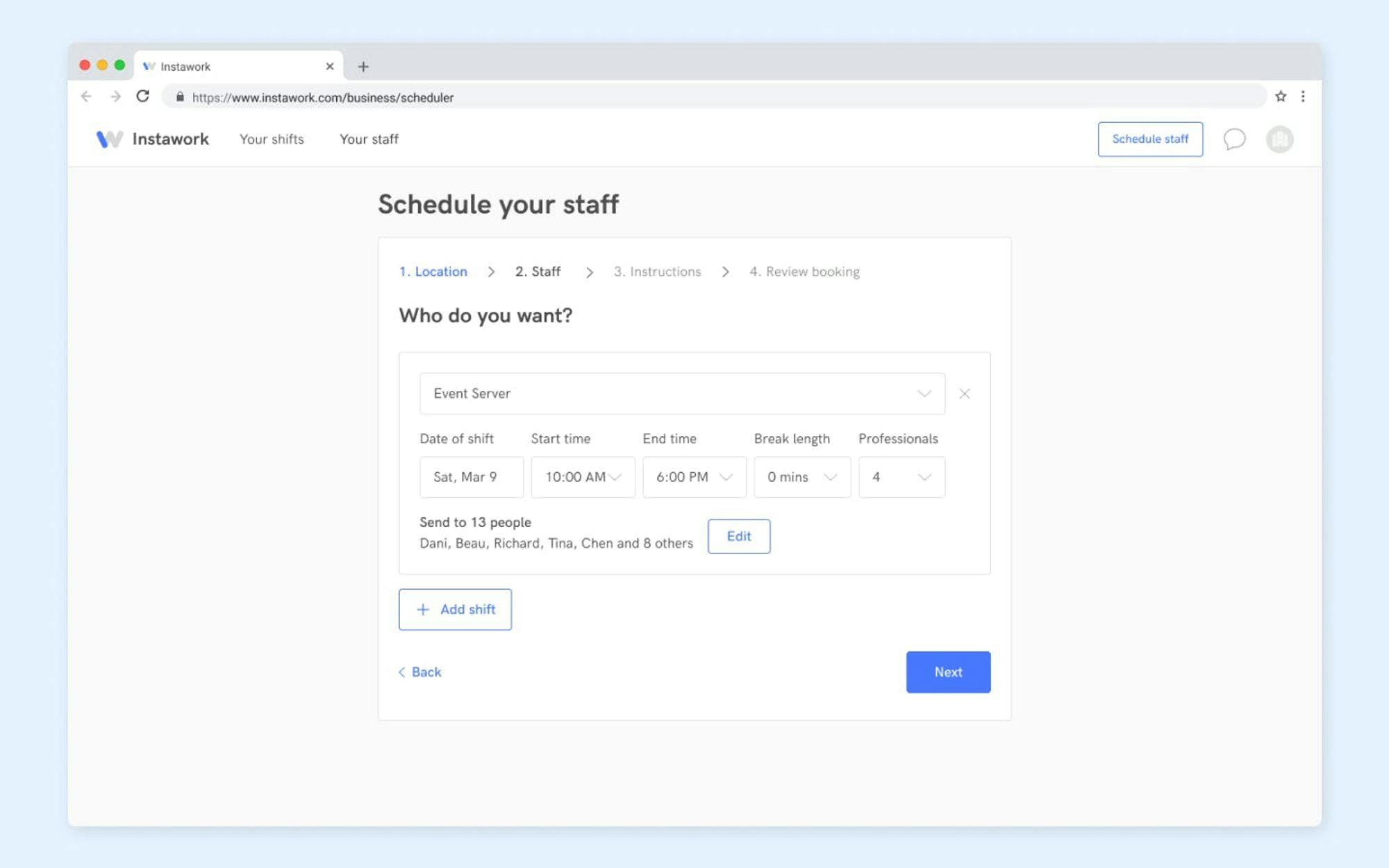 For workers, Instawork provides an app that allows them to view and accept shifts, track their earnings, and set their schedules. Pros receive the flexibility that surveys show is increasingly important to workers, while enabling them to make more money.