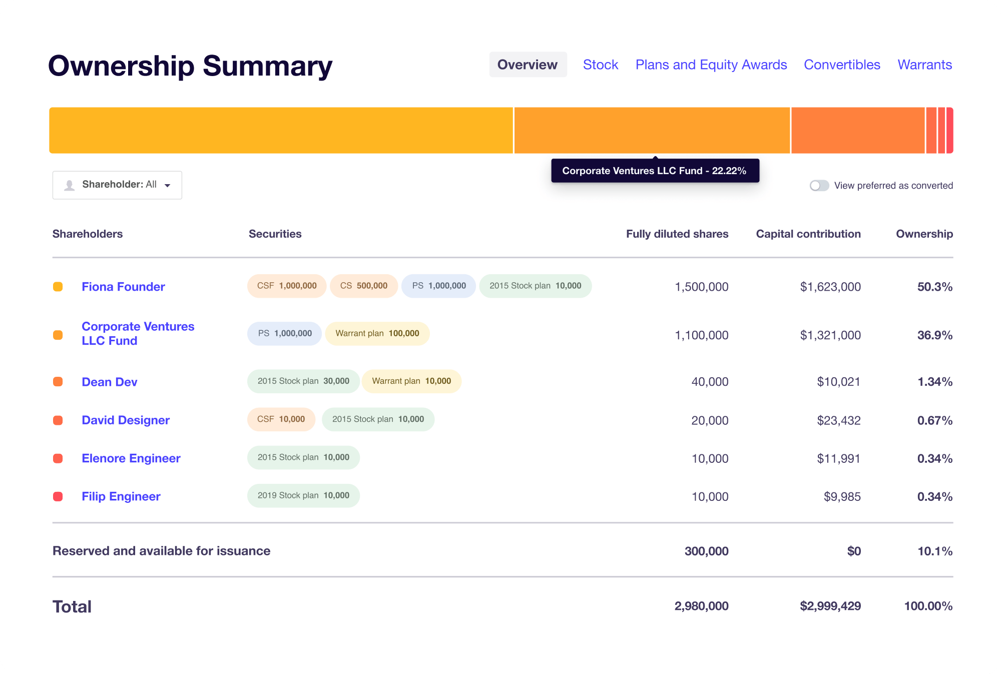 LTSE Equity is an equity management platform for startups of all sizes. It helps private companies manage their cap tables, issue stock options, perform 409A valuations, meet compliance requirements, and create models for future financing and exit scenarios. It is the single source of truth for a company’s employees, lawyers, and investors, with access control, data privacy, and collaboration features.