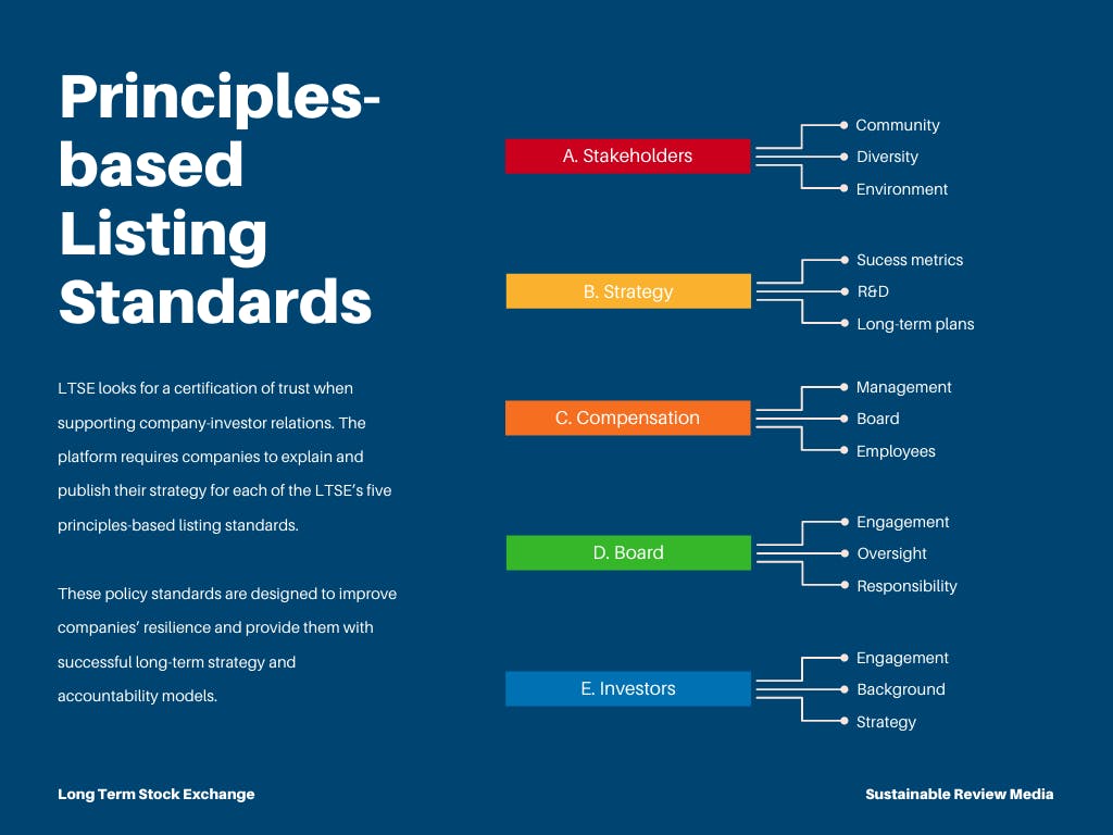 When a company decides to list on LTSE, it must outline how it will meet five key principles revolving around maintaining a long-term strategic focus, including tying executive/board compensation to long-term performance and engaging a wide array of long-term stakeholders. These principles are designed to hold companies listed on the exchange accountable for their short-term actions and reflect a company’s commitment to a higher standard of long-term thinking. LTSE requires companies that list with it to publish and maintain long-term policies.