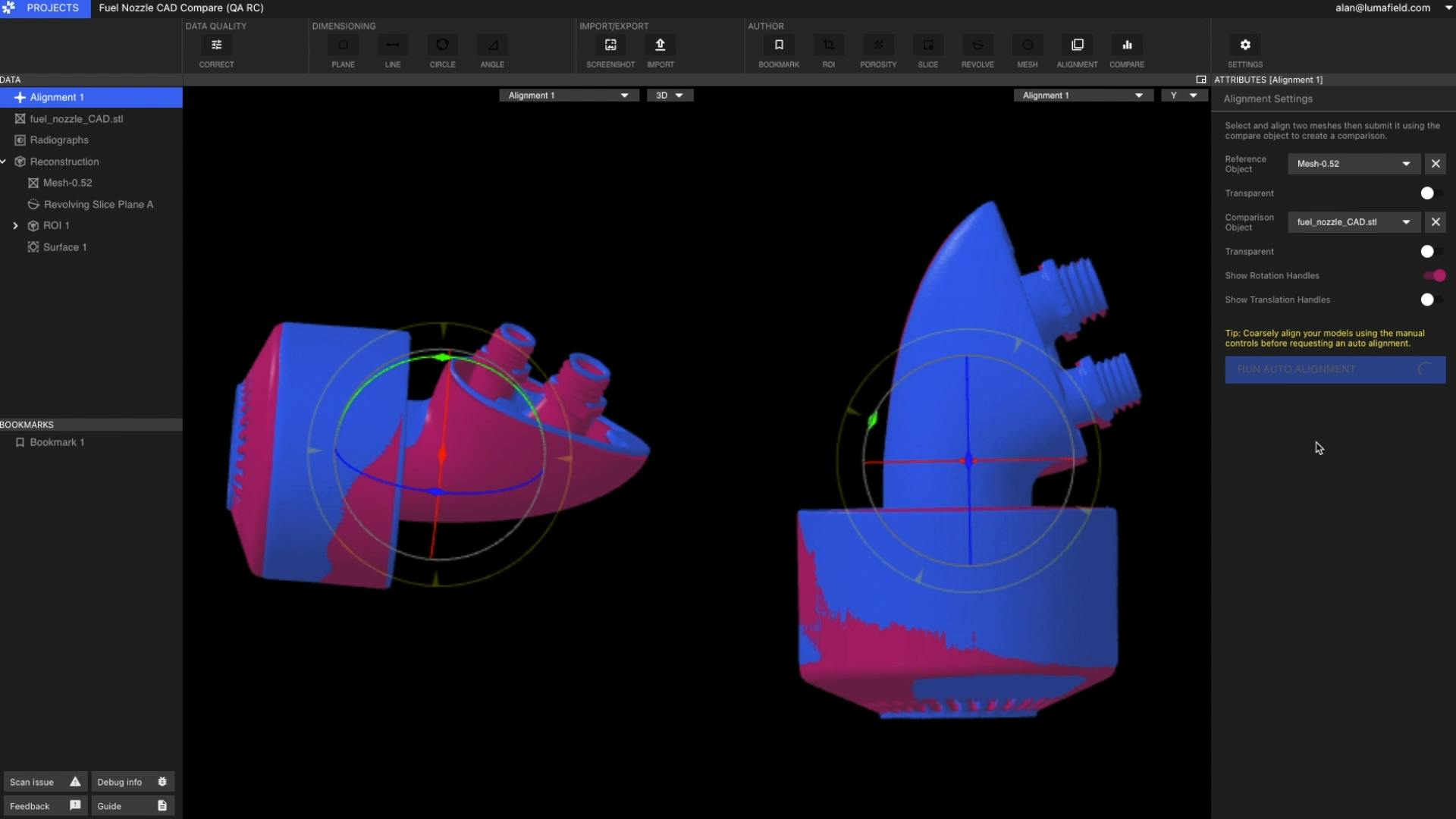 In this view, the pink and blue represent two separate parts of the same model. The blue is a mesh of a printed part, while the pink is an STL file. Auto alignment allows for a precise set of deviations between the STL and the mesh to help a user understand where there are differences between the intended and resulting outcomes. This can also be applied to two meshes. These alignments can be used on either computer-aided design (CAD) comparisons, digital files that contain a 2D or 3D model of physical objects, or scan-to-scan comparisons.
