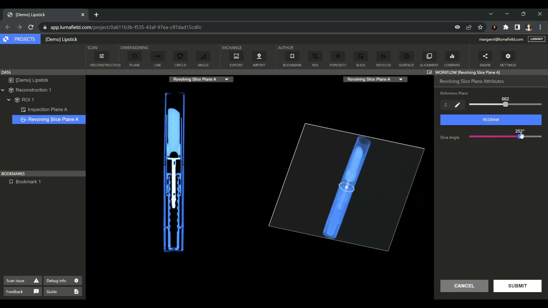 Revolving slice planes allow a user to set up a plane on the X, Y, or Z axis that rotates 360 degrees through the scan. A user would select an item to create the revolving slice plane, then create a 3-point circle to define the diameter. Once submitted, a Slice Angle Slider on the right data panel would allow a user to rotate through the part. The center of the diameter defined earlier acts as a pivot point for the rotation. These are particularly useful to inspect seals for possible leakage, assembly analysis for tubing, fittings, and valves, or analyzing the threads of a screw.
