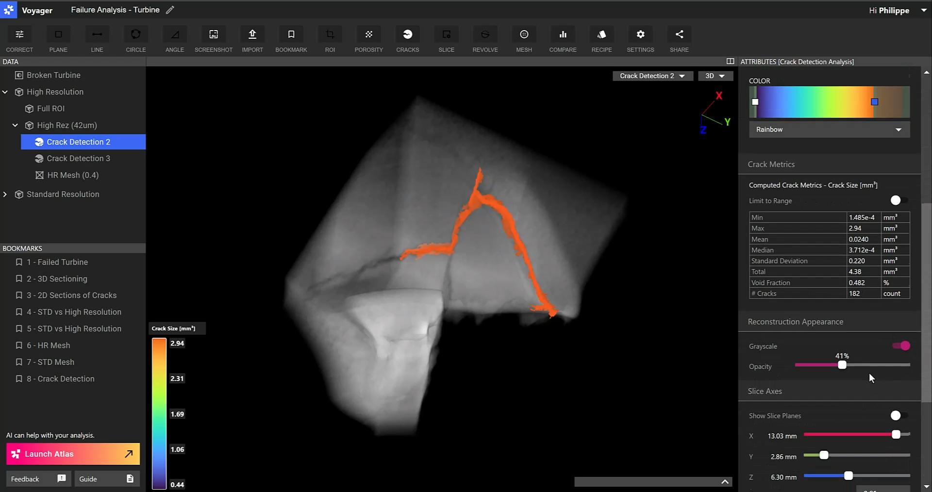 This process is similar to the porosity analysis, as are the results. Cracks are highlighted when adjusting the range map. Once Voyager has run crack detection, the analysis will appear under the volume that it was run upon in the data panel.