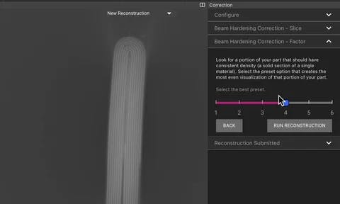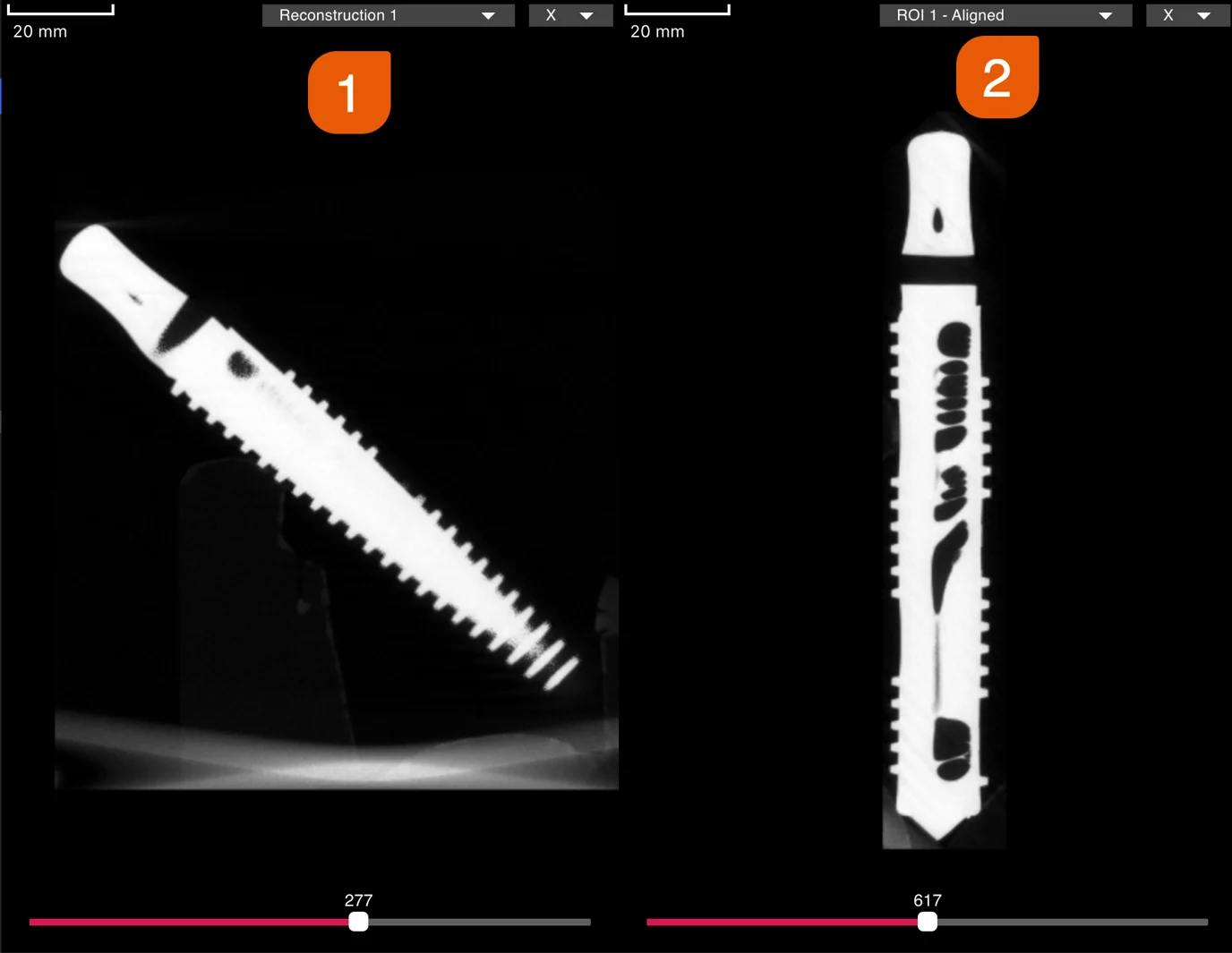 This prompts the user with a slider on top of the scan. The point where the line intersects the part in an area of interest is shown as a darker, more dense region where beam-hardening artifacts are more likely to be present.
