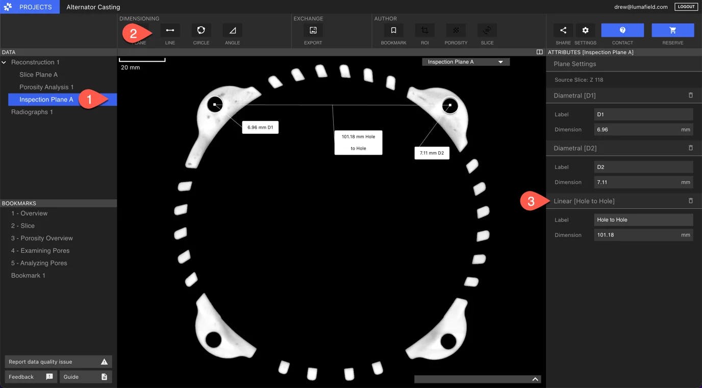 Lumafield’s dimensioning tools include options for drawing circles, lines, and angles, each labeled for clarity. A line can be created with two points, a start and end point. A circle is defined using three points along its perimeter. For an angle, four points are used: two for each line that forms the angle. The label’s location determines what angle is being measured.