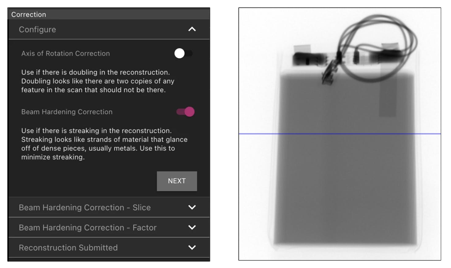 BHC is used to correct beam hardening artifacts and reduce streaking artifacts in the software. This panel can be seen on the right once clicking the correct button in the toolbar, and turning on the BHC option.