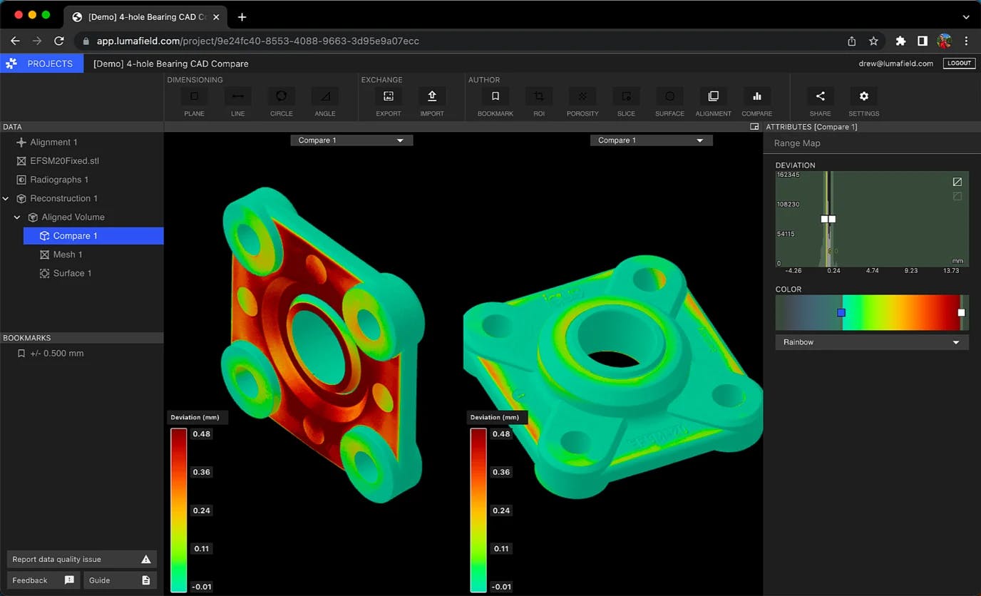 Voyager is Lumafield’s cloud-based inspection platform that runs directly in a web browser. It enables users to visualize, analyze, and share CT data from any computer, regardless of their location. It can be used to consolidate data from industrial CT scanners or 3D surface scanners.