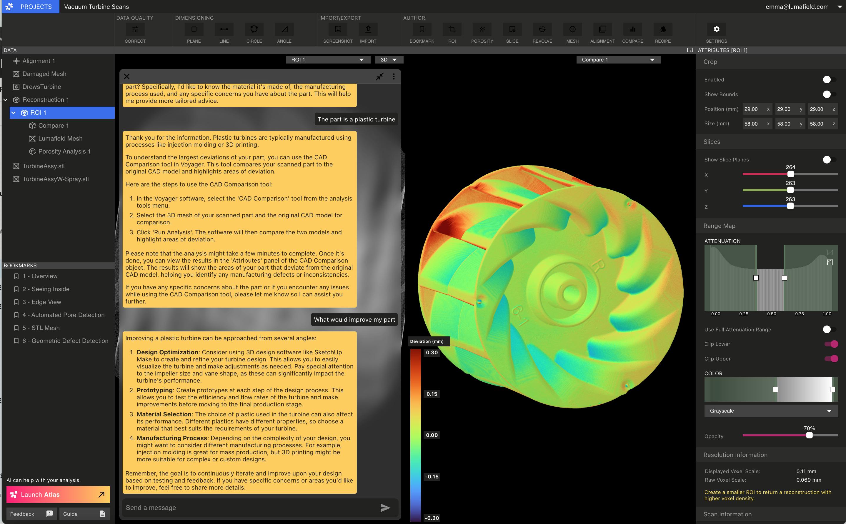 Atlas is an AI agent embedded into Voyager. It is trained on engineering knowledge to identify issues like anomalies and generate annotated bookmarks that highlight features. Lumafield claims to reduce weeks of quality assurance processes to mere minutes, enabling a single engineer to accomplish what once required a dedicated team. Atlas pops up as a simple chat interface from the bottom left of the screen and is prompt-based. It can initiate workflows such as porosity analysis, CAD comparisons, and scan-to-scan comparisons.