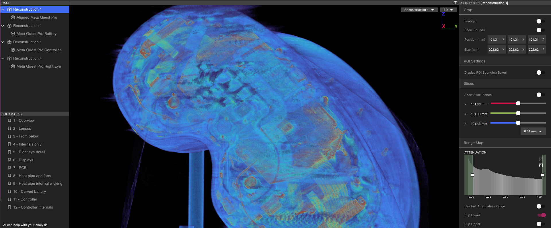The data tab, found on the left of the data and attribution panel, contains scan and project information. Data can include information on reconstruction, radiographs, porosity, CAD comparisons, and more. Attributes found on the right are adjustable parameters directly associated with the data. These attributes include options for cropping, controlling the slice, adjusting the view, setting the range, managing color mapping, and altering opacity.