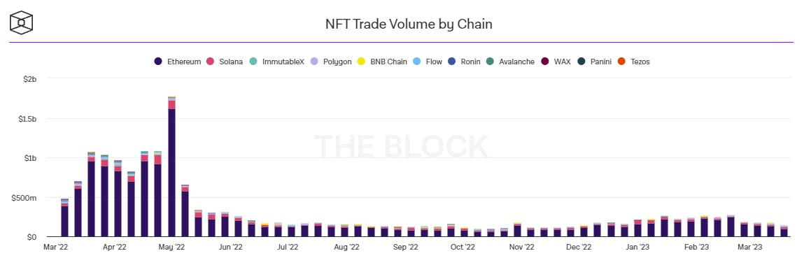 The global NFT market size rose to an estimated $3 billion in 2022, with a CAGR of 35% leading to projections of a $13 billion market in 2027. However, the crypto market saw a significant slowdown in the latter half of 2022 amid a changing macroeconomic climate, which continued through the first three months of 2023. Key potential drivers for future growth include continuing mainstream adoption of NFTs, advances in blockchain technology, and a development community working on improving utility and real-world application for NFTs.