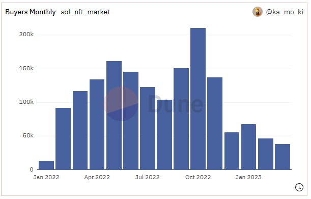 Blur: Founded in 2022, Blur is an NFT marketplace that caters to professional traders. In February 2023, Blur overtook OpenSea in trading volume as OpenSea struggled to handle the issue of creator royalties, which Blur capitalized on. Blur’s high trading volume is attributed to several wallets trading high-profile NFTs from collections like Bored Ape Yacht Club, Pudgy Penguins, and Doodles. Blur developed a loyalty program where creators who list exclusively on Blur are rewarded with loyalty points, which grant users future airdrops of the $BLUR token. While Blur does not support Solana NFTs today, its challenge to the incumbent OpenSea with zero trading fees, easy creator royalty policies, and a loyalty program could threaten Magic Eden if Blur expands to the Solana blockchain. Blur raised $11 million in a seed round led by Paradigm in March 2022.