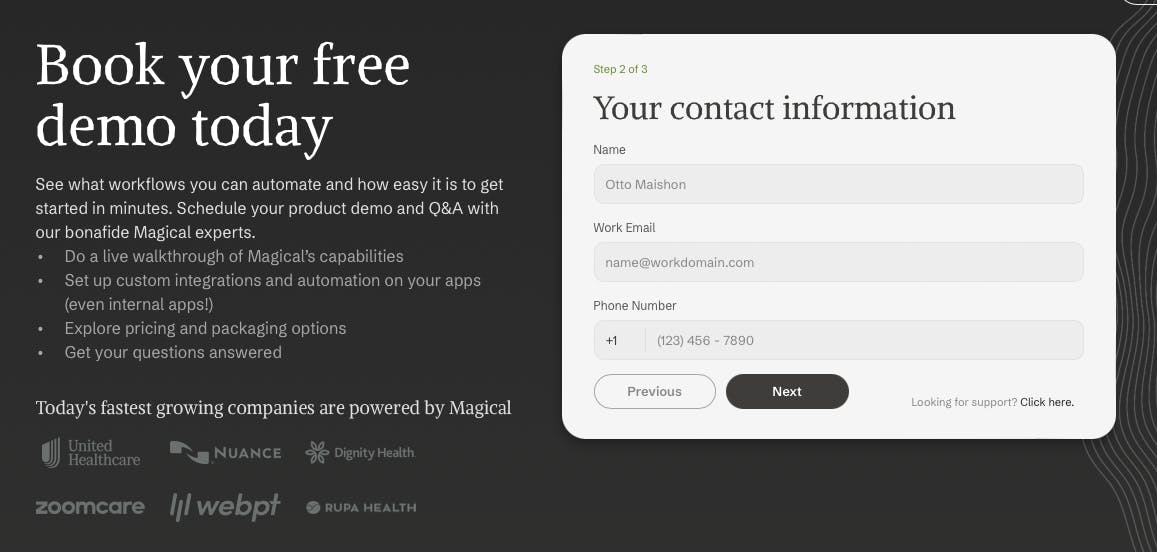 As of May 2025, GetMagical appears to be shifting toward an enterprise-focused business model. Magical’s core features, text expanders, and autofill, remain free via its Chrome and Edge extensions. The company appears to be monetizing its more advanced AI-powered, agentic products through enterprise sales. Demos are used to showcase these capabilities with tailored examples relevant to the customer’s workflow. During these demos, enterprise customers can discuss their specific use cases and pain points. Pricing and packaging are explored during these calls or later calls.