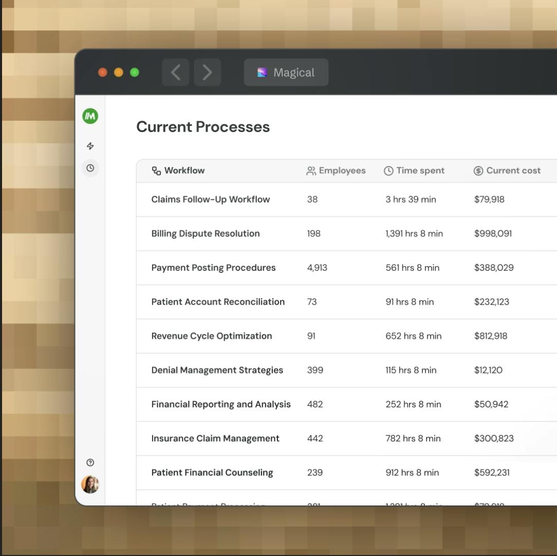 Magical serves enterprise customers looking to automate time-consuming tasks and workflows. The platform enables companies to begin automating within days using one-click automations and also identifies additional automation opportunities. While not limited to specific industries, Magical highlights use cases in healthcare, customer support, finance, and insurance. As of May 2025, Magical had 950K users across 100K companies, including Amazon, Airbnb, Netflix, Atlassian, HubSpot, and Intuit.