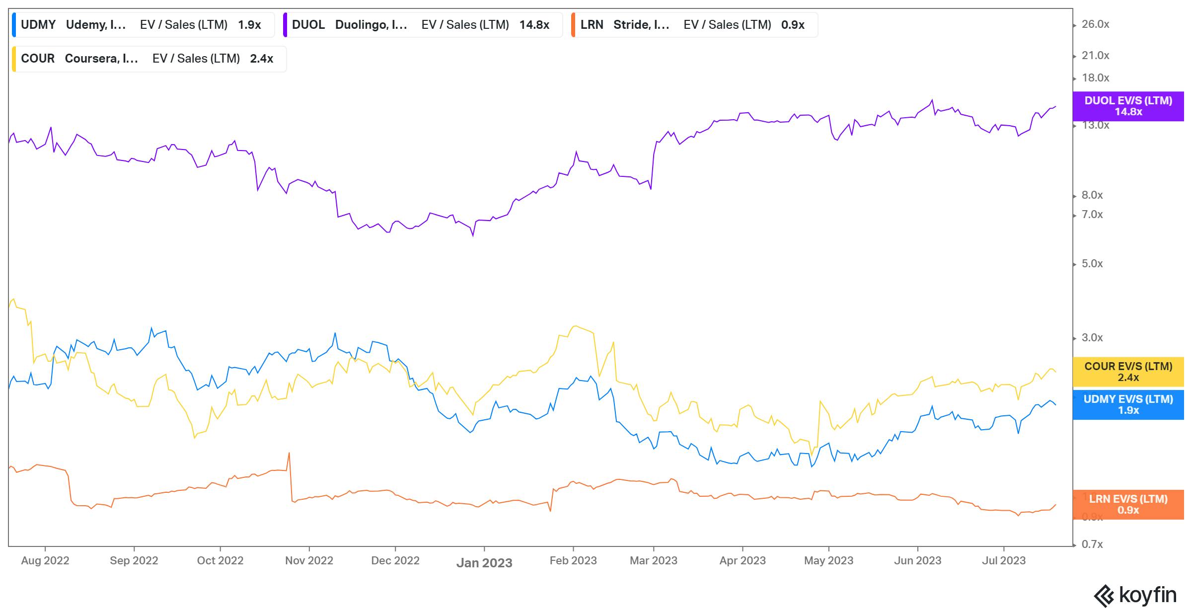 MasterClass's $100 million ARR puts it at a 27.5x revenue multiple as of 2021. In comparison, public competitors in the online learning space such as Udemy, Coursera, Duolingo, and Stride are traded at revenue multiples of ~1-15x as of July 2023.