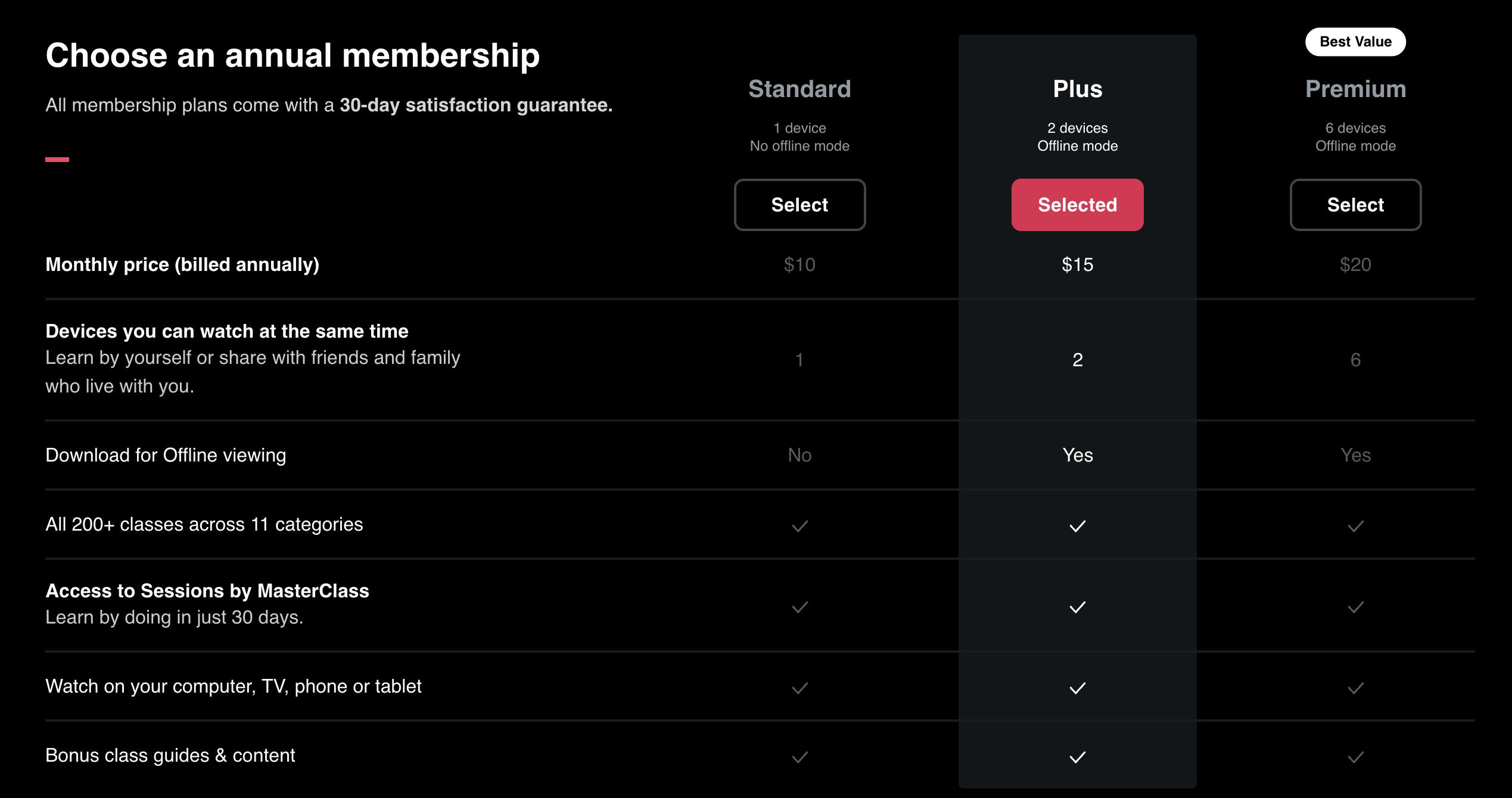 MasterClass offers its content via an annual subscription which gives users access to its library of content. In late 2022, it was reported that subscriptions accounted for 100% of MasterClass's revenue. MasterClass offers three different membership tiers as of June 2024: Standard, Plus, and Premium: