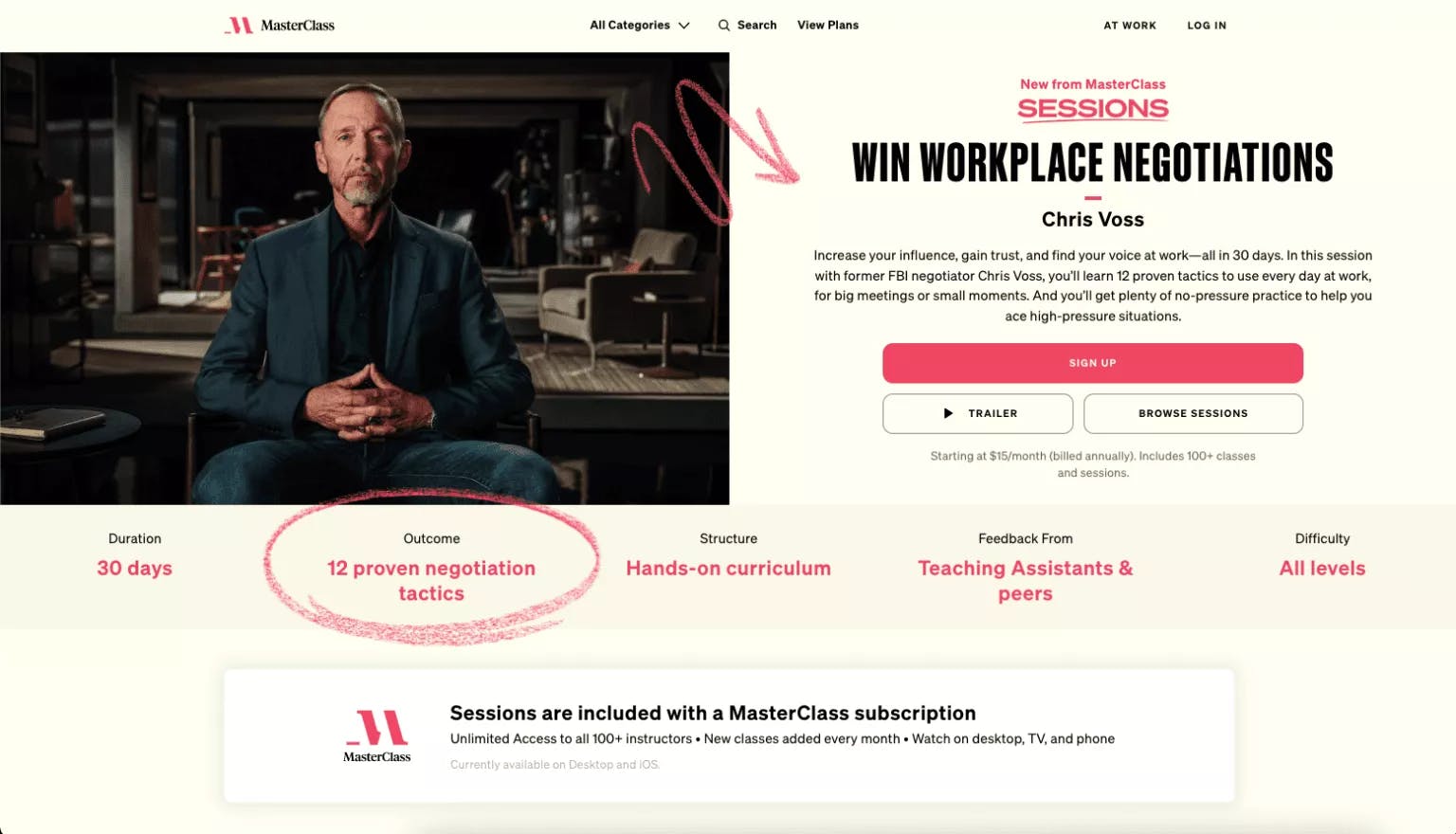 In 2021, MasterClass began investing more resources in its B2B offering for enterprises, MasterClass at Work. The company began creating courses with a professional development theme that could be packaged in a corporate subscription program, but that could also be of interest to other MasterClass users, in 2022 and 2023.