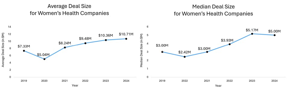 The broader US femtech market, encompassing technology-driven innovations in women's health — from virtual care platforms to wearables and software — was valued at $39.3 billion in 2024 and was anticipated to grow at a CAGR of 16.4% through 2030. This growth reflects increasing demand for women’s healthcare solutions, driven by the rising adoption of digital health technologies and advancements in AI and virtual assistants, enabling more personalized and accessible care. Average deal sizes for women’s health companies have also grown significantly, doubling from $5 million in 2020 to $10.7 million in 2025, further highlighting the sector's expansion and investment potential.