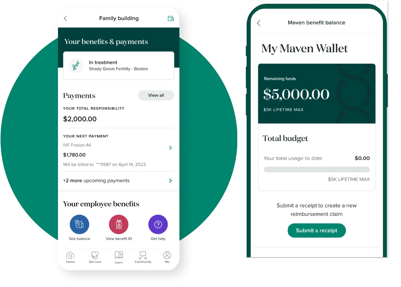 Maven Wallet is an expense management solution that simplifies financial support for employees’ fertility and family-building needs. Employers determine eligibility and configure coverage, offering either reimbursement-based options or the Maven Card — a debit-like card linked to employer-sponsored funds. The Maven Card helps members avoid out-of-pocket expenses within benefit maximums, providing access to services like fertility treatments, adoption, surrogacy, and childcare.
