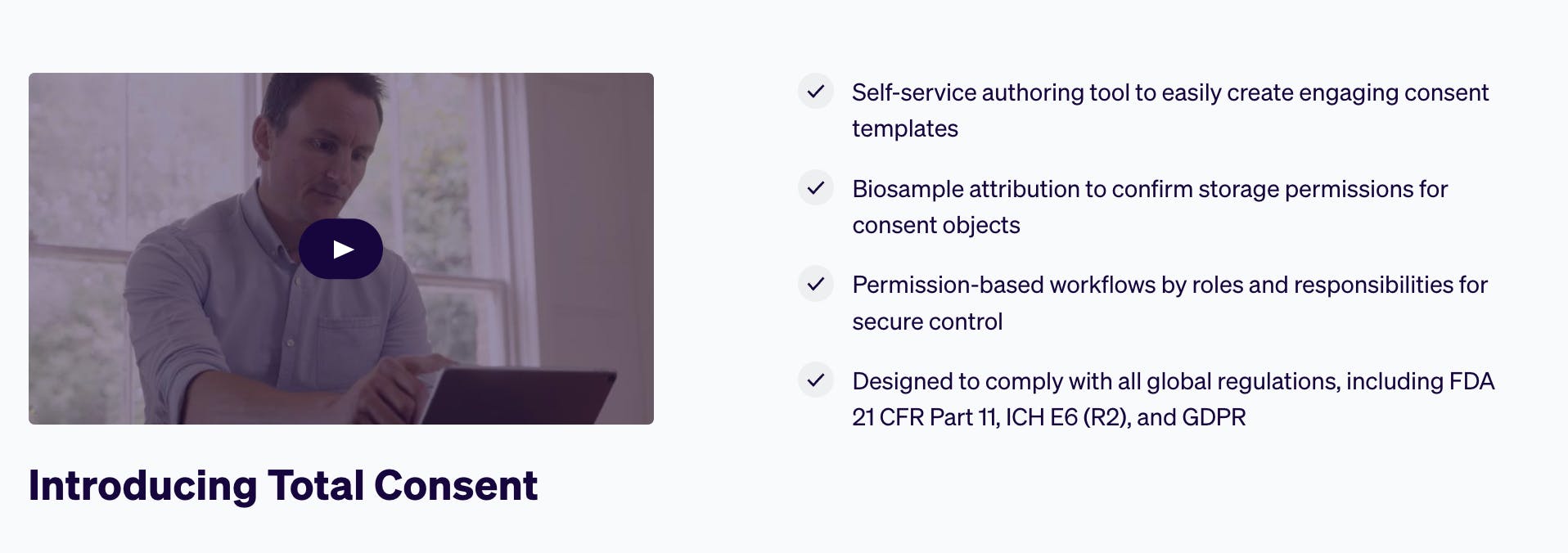 Total Consent is a solution to help inform and consent trial participants that can be done in-clinic or remotely using a computer, phone, or tablet. It has an integrated TeleVisit feature to easily collect compliant signatures and meet patient standards.