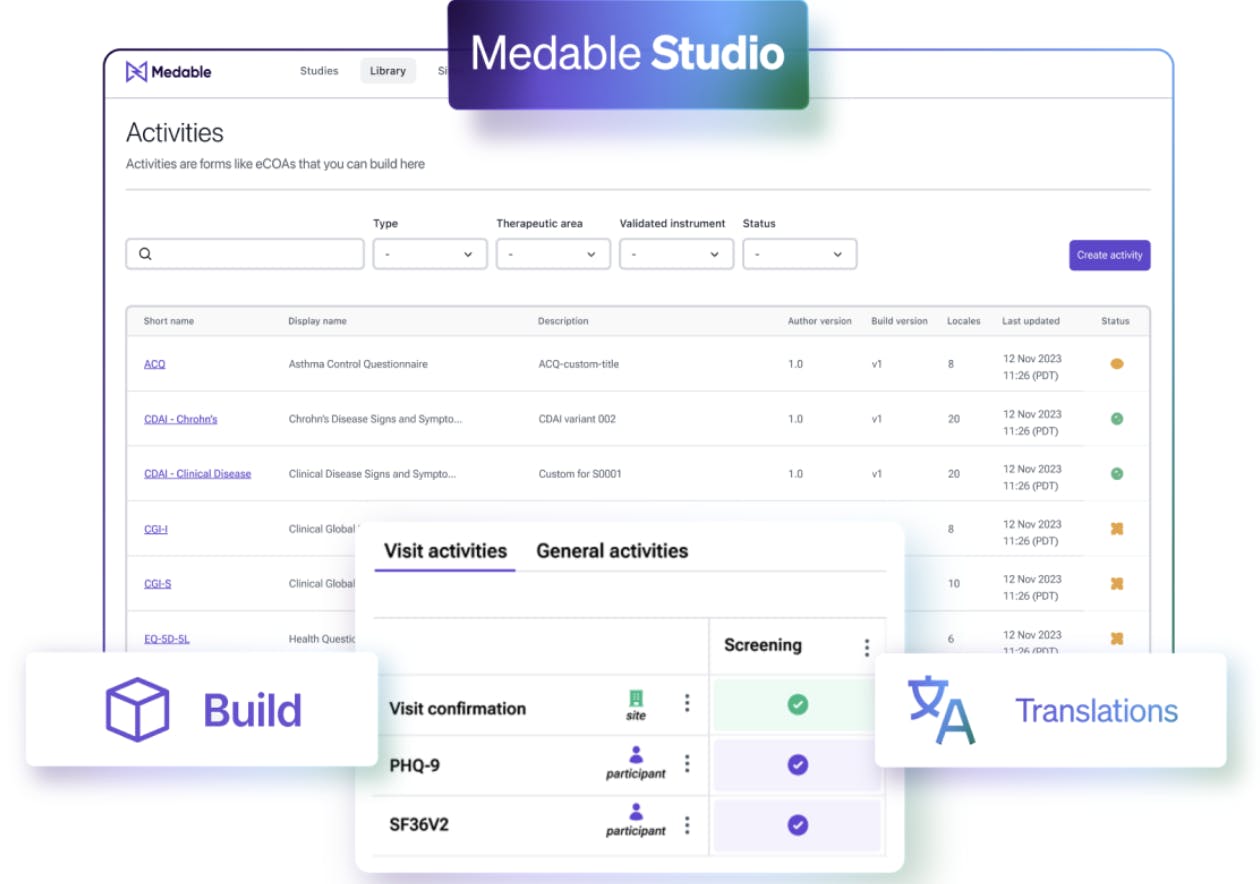 Cross-Study Content Library: Stores assessments, instruments, translations, and locales all in one system for easy reuse from study to study.