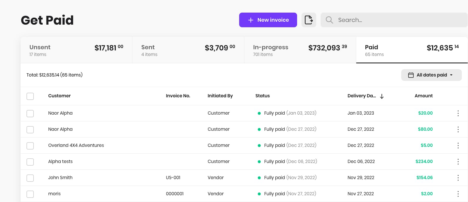 Send a request: Invoices are sent with a unique email link with a built-in pay button - business customers can pay immediately.