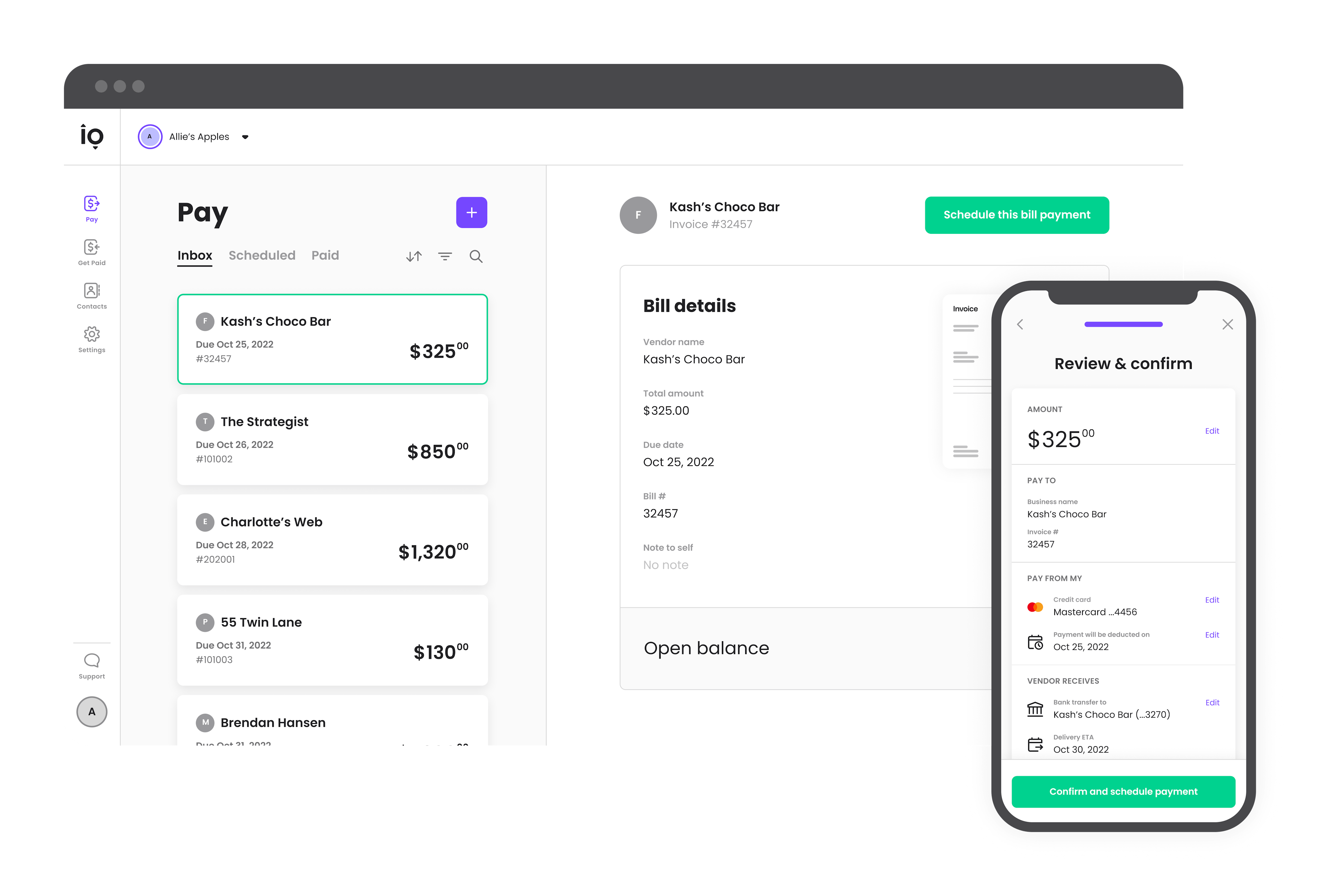 Pay: Payments can be made via ACH for free, credit card for a 2.9% fee, or paper checks for $1.50 each). Options include standard and expedited payments, such as fast checks (within three business days), same-day ACH, or instant transfers for immediate processing, providing businesses with cash flow flexibility.