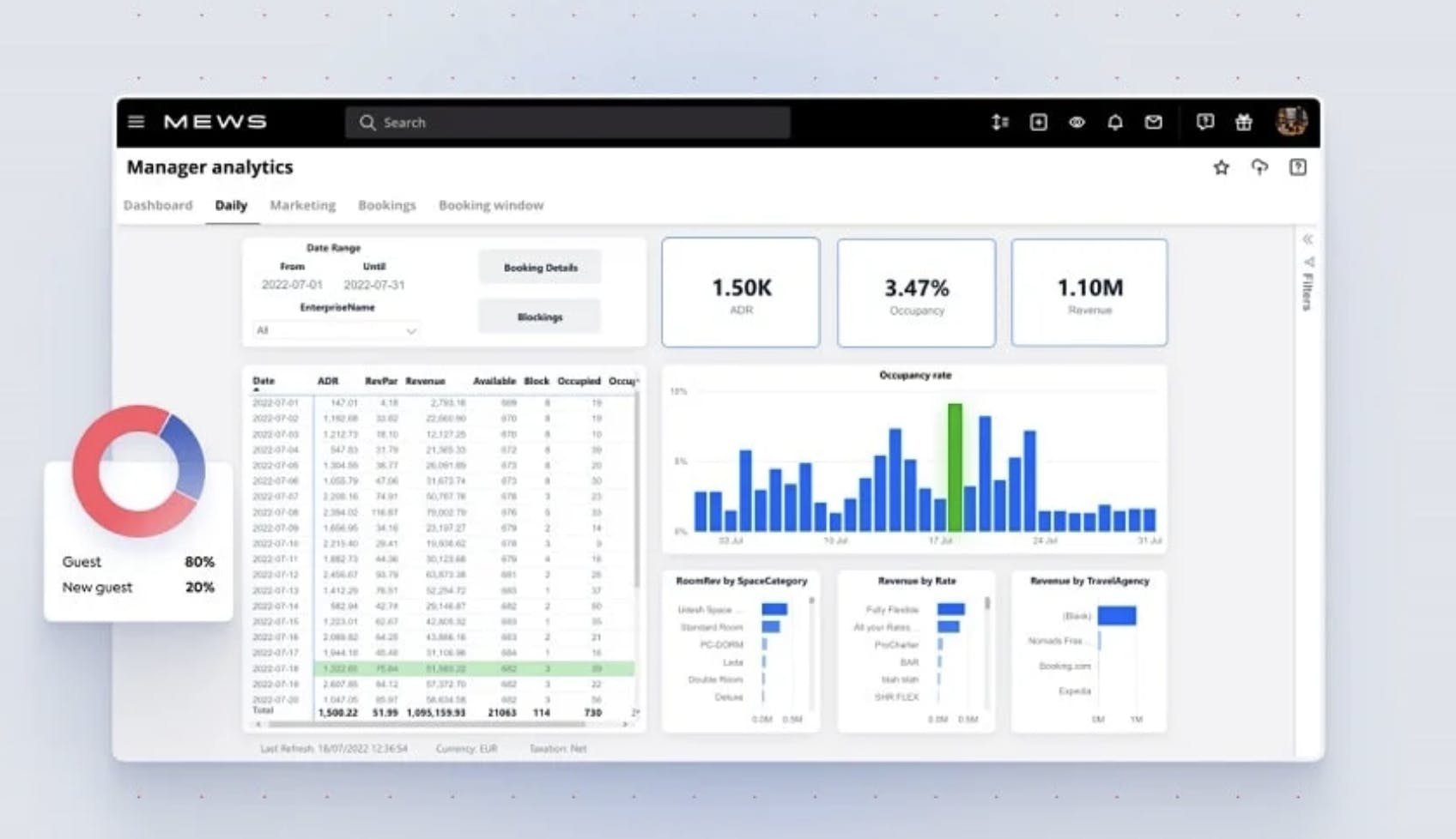 Mews also offers a business intelligence solution with analytics and reporting capabilities specifically built for the hotel industry. Mews allows its hotels to compare their performance with others using Mews’s anonymized data. Users can view historical data, current performance, and target figures across operations, finance, and guests. It supports manager reports, reservation reports, accounting reports, bills and invoice summaries, and occupancy reports.