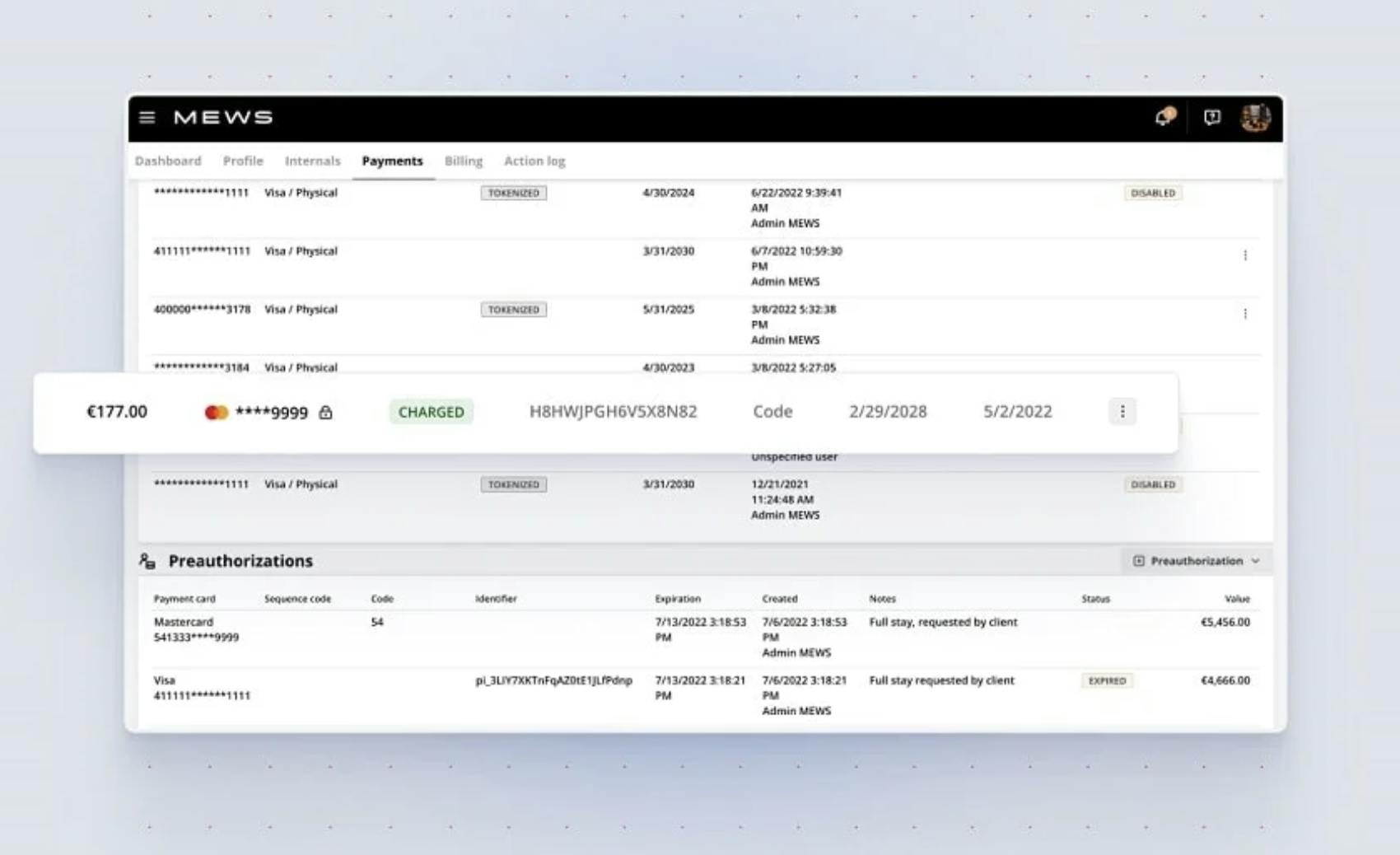 Mews Payments is a payment gateway integrated into the PMS to process online and offline payments. It supports 10+ payment methods in 40+ countries, and offers one-click payments, transactions overview, settlement rules, virtual card detection, kiosk payments, and central reconciliation.