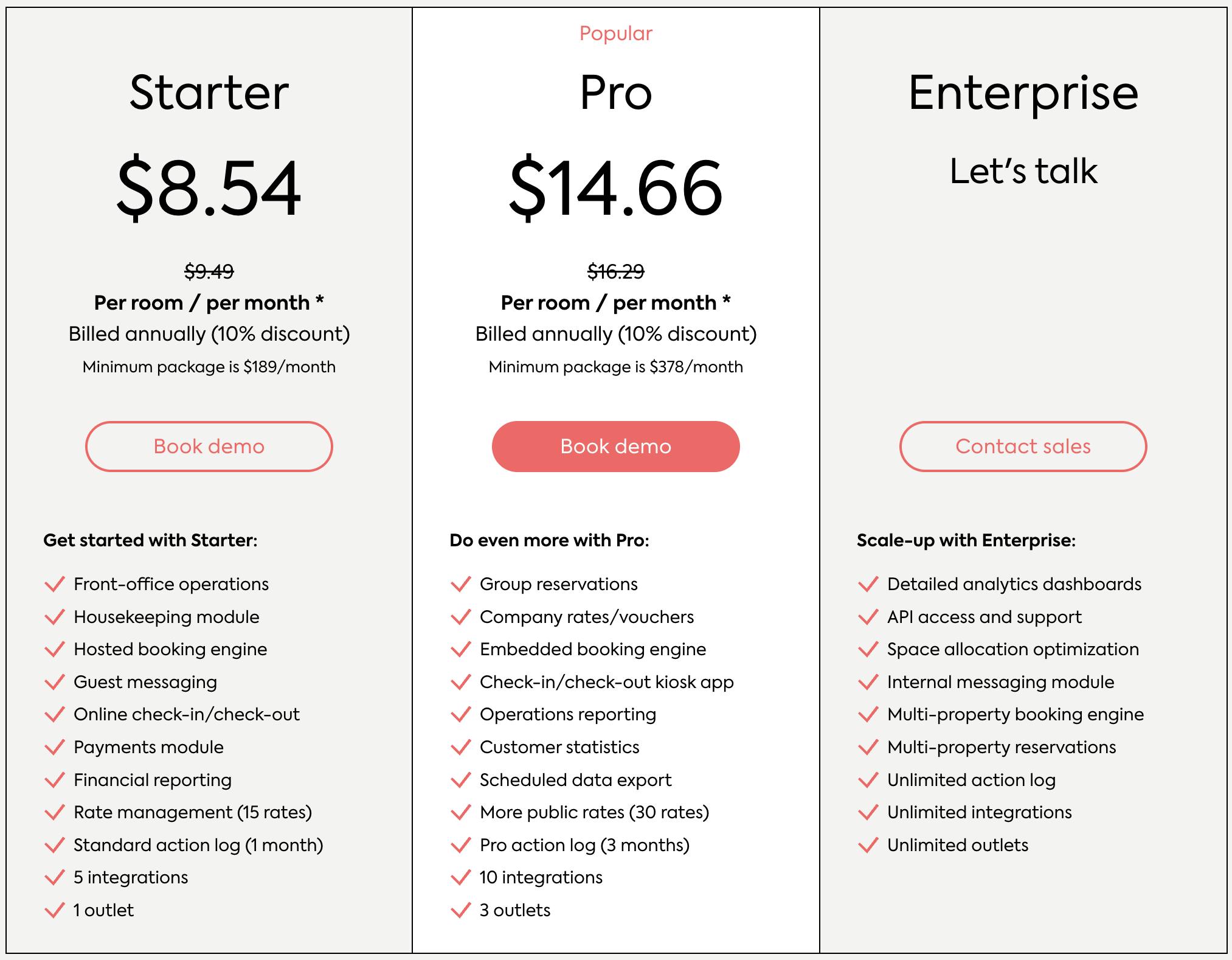 It charges a SaaS fee based on the number of rooms the hotel has. For instance, a hotel with 50 rooms on the Pro Plan will pay $8.8K annually.