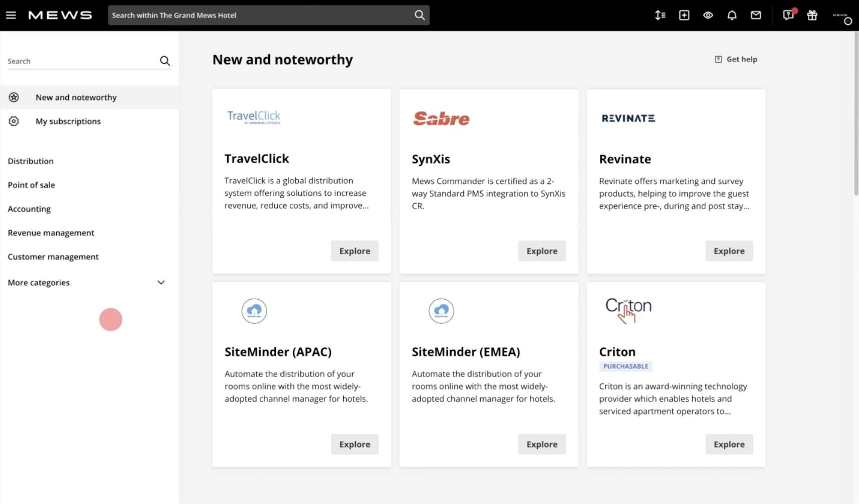 Mews has a marketplace with 750+ solutions connected to the Mews platform. On its marketplace, Mews offers integrations in categories like accounting, customer management, business intelligence, revenue management (Smartpricing, RoomPriceGenie, Pace), reputation management (GuestRevu, Qualitelis, ReviewFilter), or distribution with channel managers (SiteMinder, D-Edge, Booking.com). On average, Mews customers take advantage of eight integrations via its marketplace.