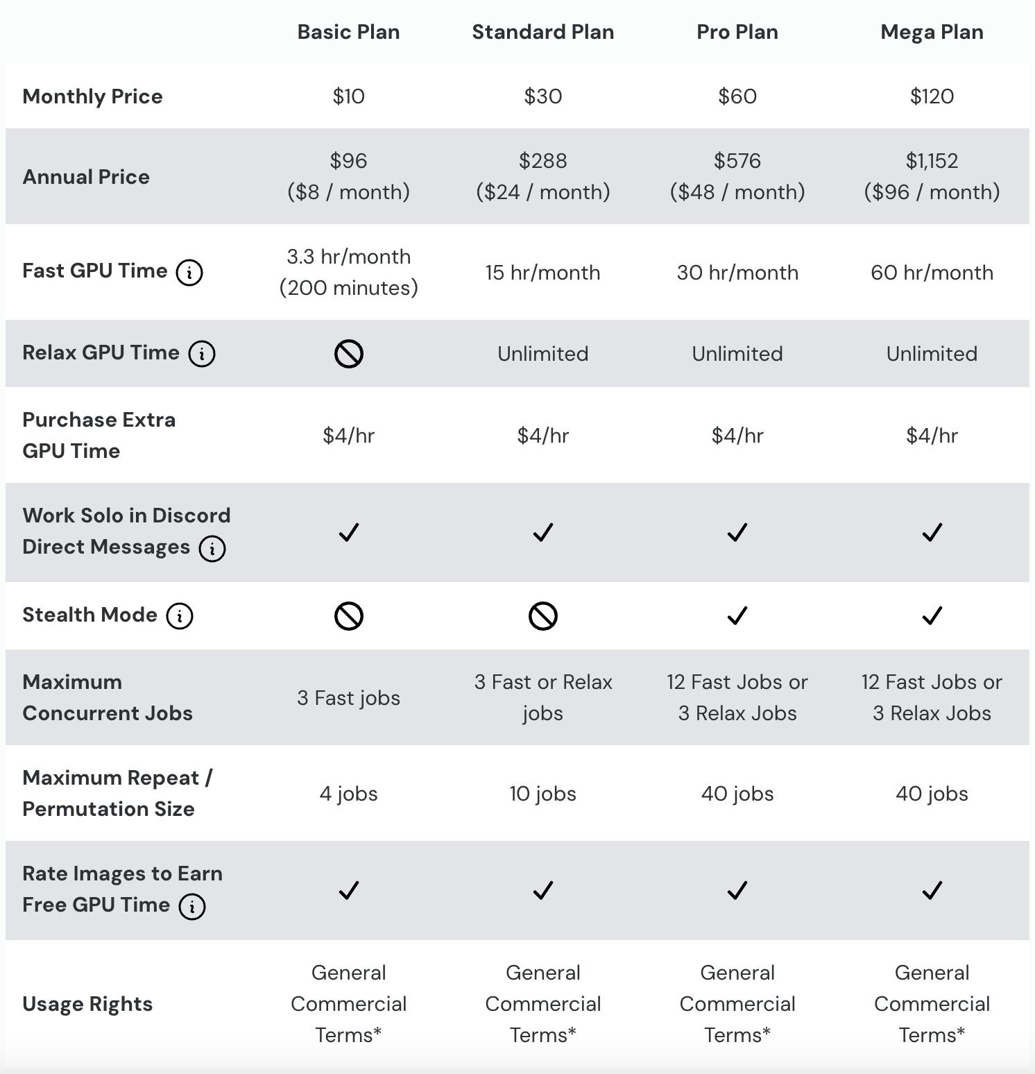 Midjourney generates revenue through its tiered subscription models, offering different plans ranging from $10/month for the most basic plan to $120/month for the highest tier, and it encompasses various features such as Fast GPU Time, concurrent jobs, and privacy control.