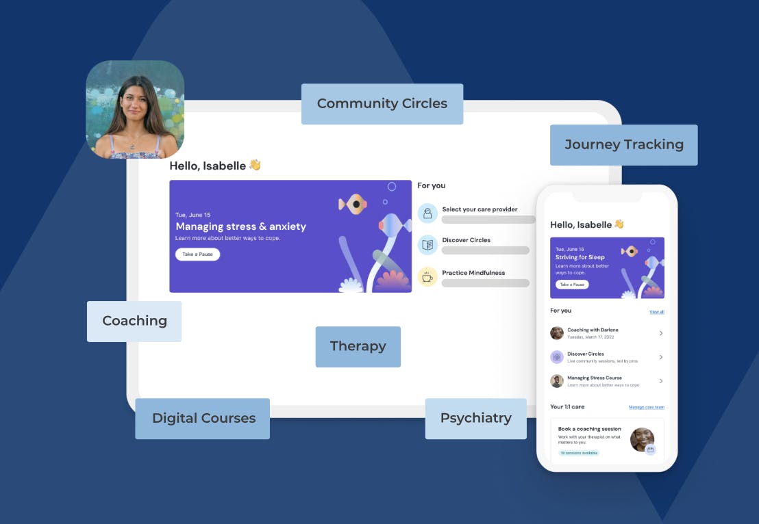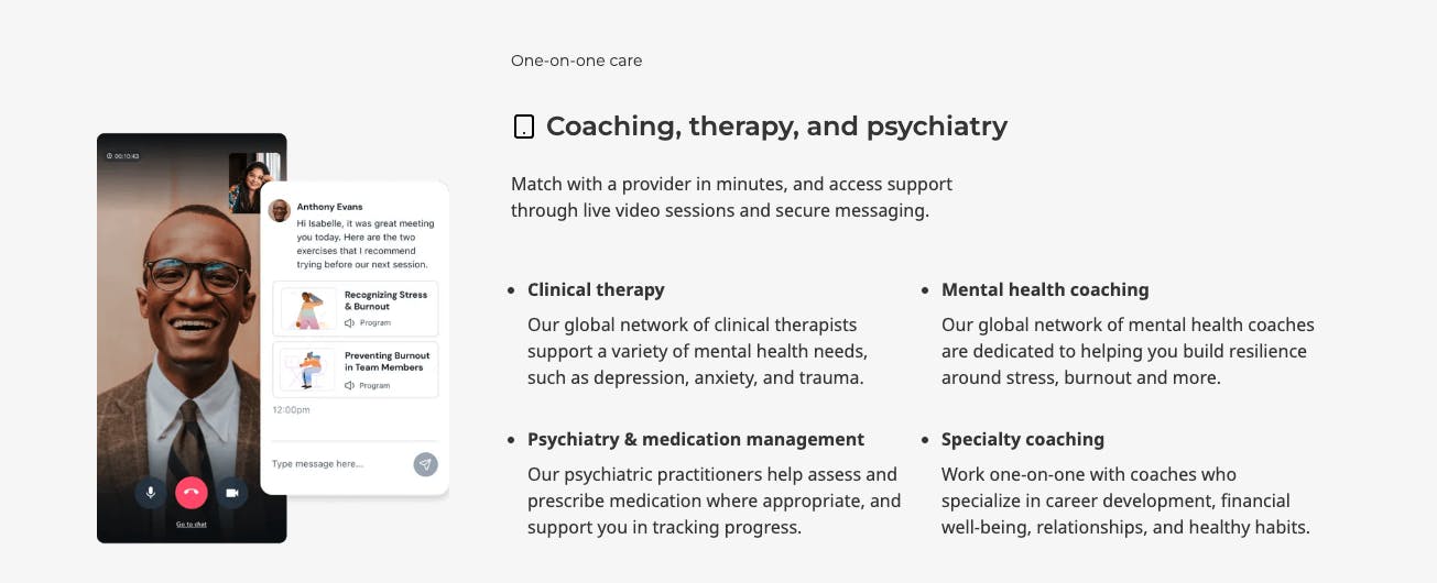 Modern Health’s one-on-one care offering includes coaching, therapy, and psychiatry services. Members can match with a provider in minutes and access support through live video sessions and secure messaging via the app.
