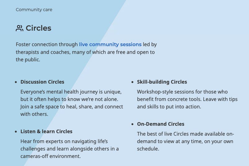“Circles” are live community group sessions led by therapists and coaches, many of which are free and open to the public. “Discussion Circles” provide a space for members to share and connect with others, while “Listen & Learn Circles” allow participants to have access to expert opinions on navigating challenges.
