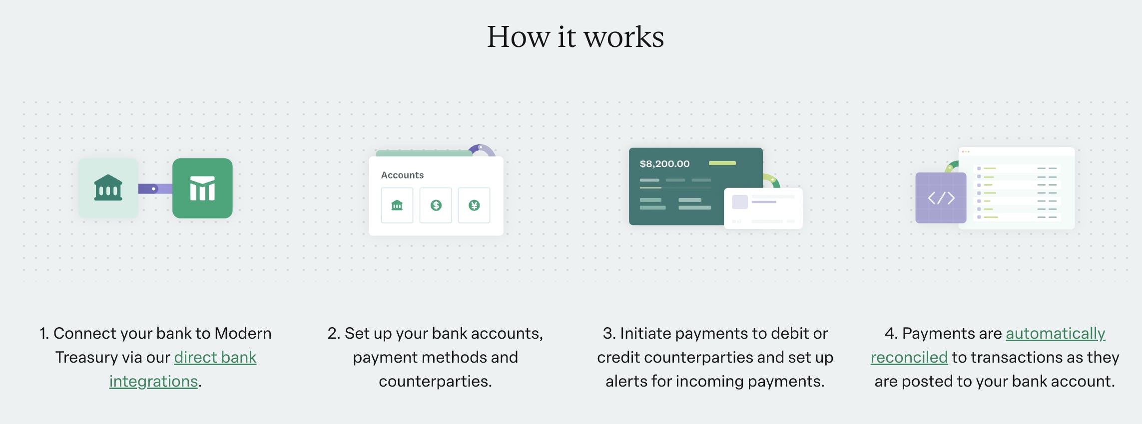 Modern Treasury’s Payments product allows customers to integrate with banks on Modern Treasury’s network using one API. Instead of building their integrations with different banks and for different payment methods, customers can send and receive payments programmatically over ACH, wires, and RTP using Modern Treasury’s API.